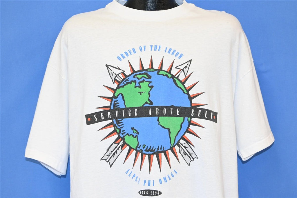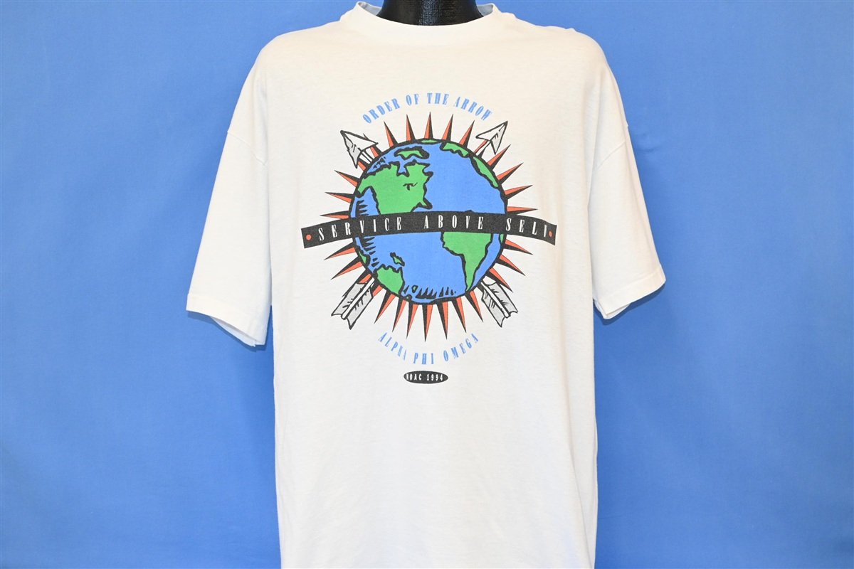 This cool vintage tee was made for the 23rd edition of the National Order of the Arrow Conference, which was held in 1994 at Purdue University. The theme of that year's conference was "A Journey for One, An Adventure for Many", and this shirt bears the message "Service Over Self". This shirt also mentions the Alpha Phi Omega fraternity, which is noted for having been founded by Boy Scouts alumni, and for basing their principles off of those of the Boys Scouts of America.