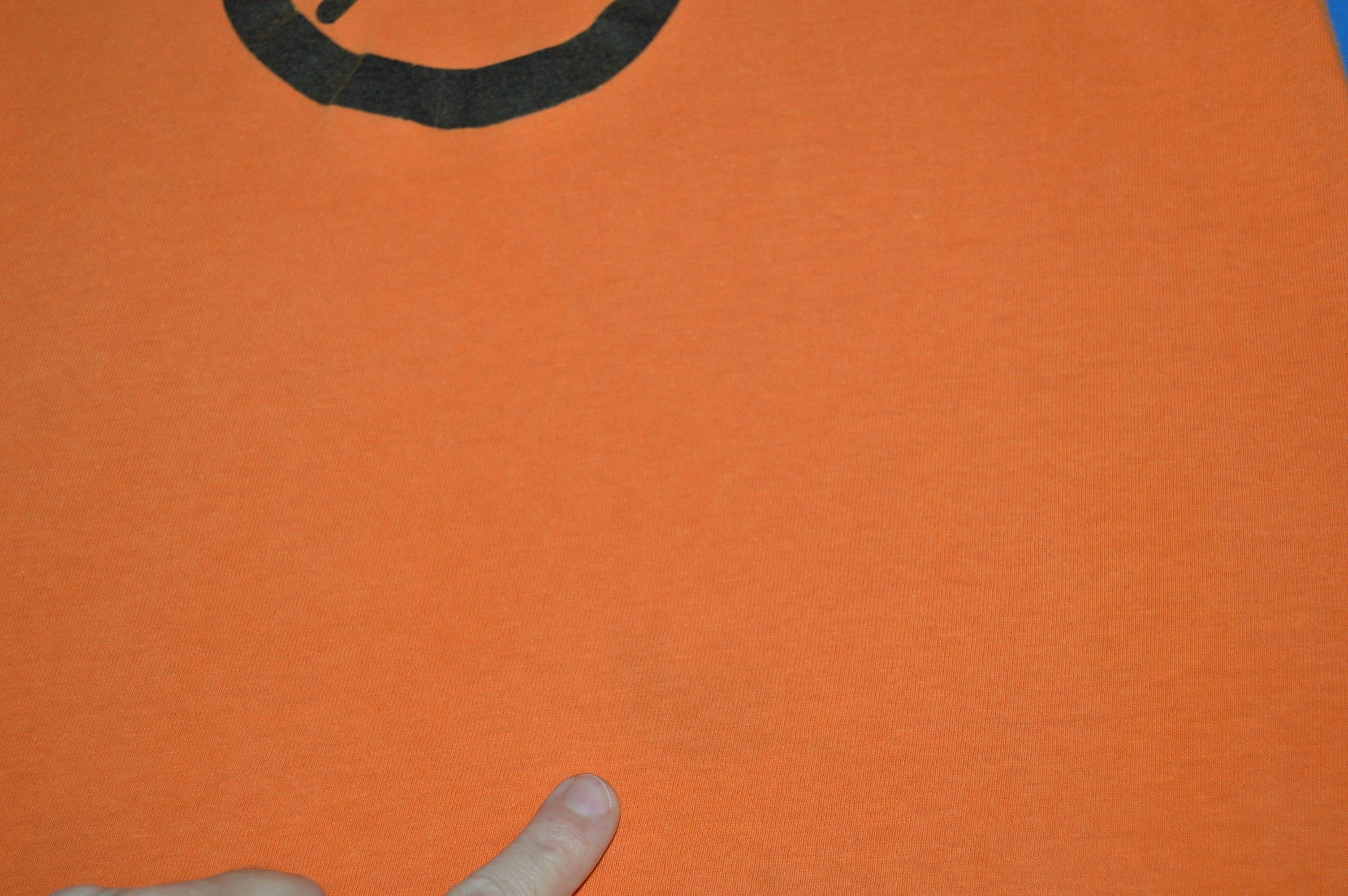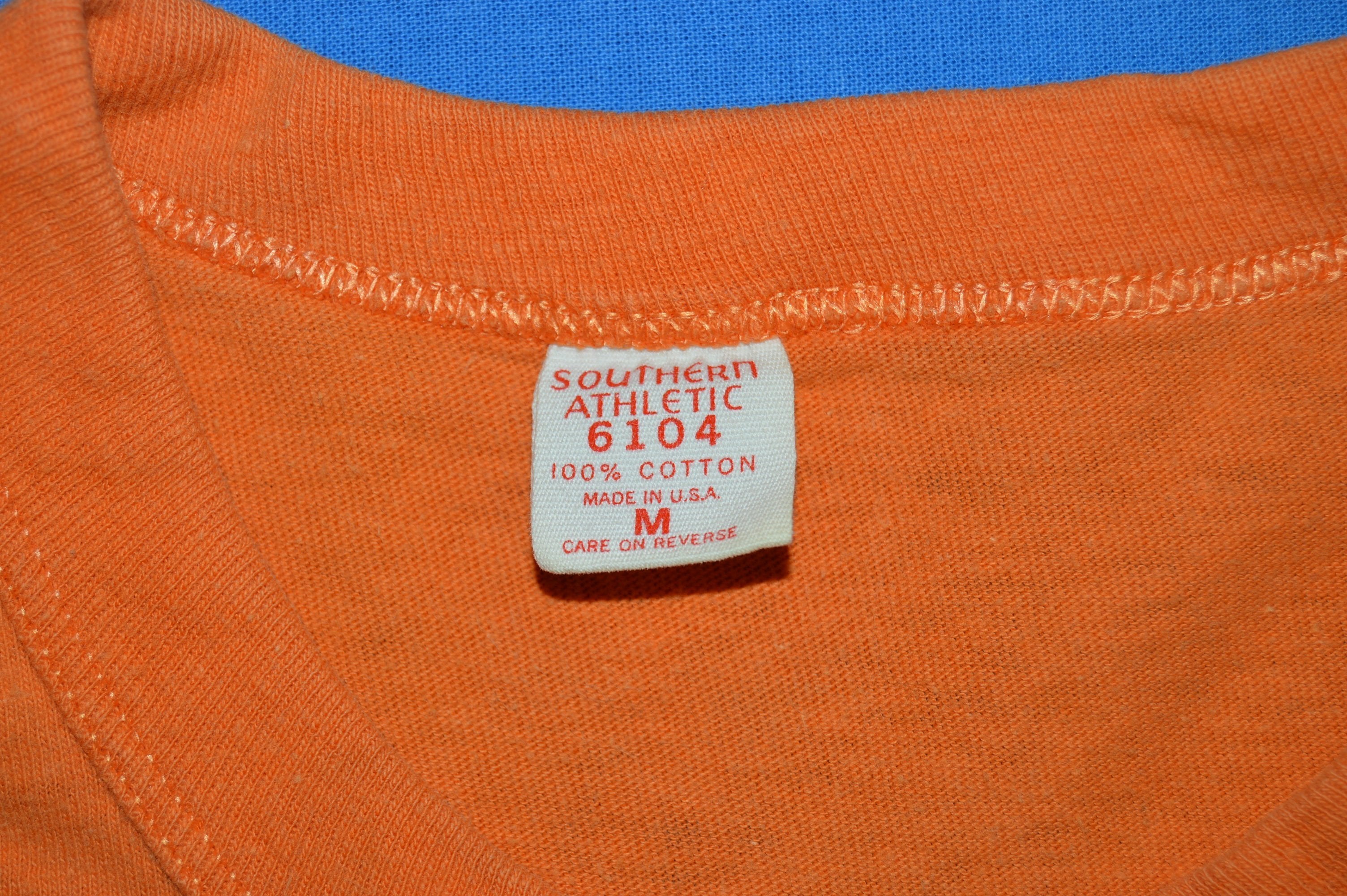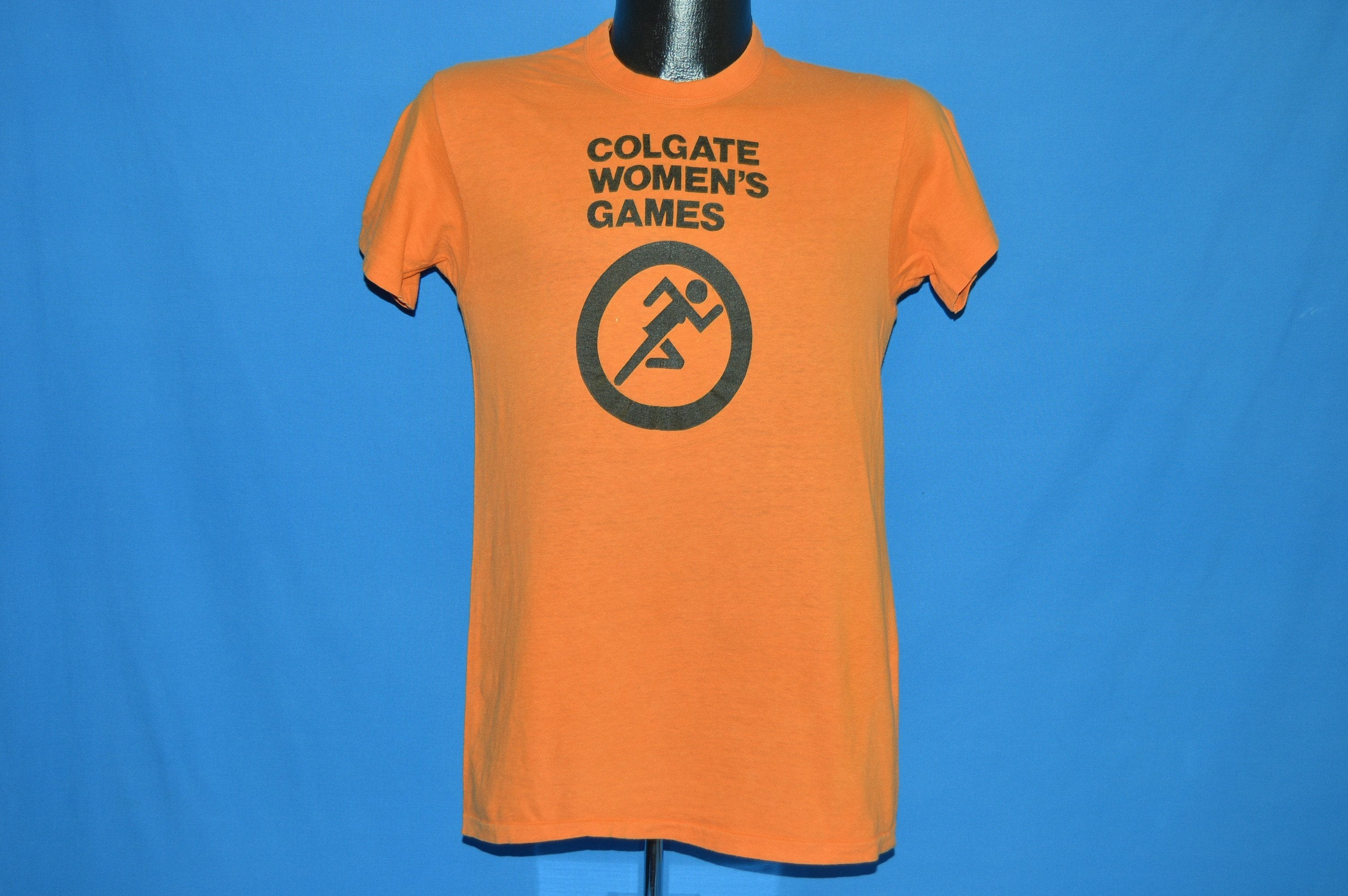 This orange vintage t-shirt has a design for the Colgate Women's Games. The black graphic on the front is a track and field stick figure image. The Colgate Women's Games is the largest amateur track series in the United States and is open for all ages from six and up. Competitors can participate in preliminary meets to determine who competes at the games as finalists. Participation in the games is completely free as the event is meant to provide opportunities for young women who may not otherwise get to participate in an organized sport.