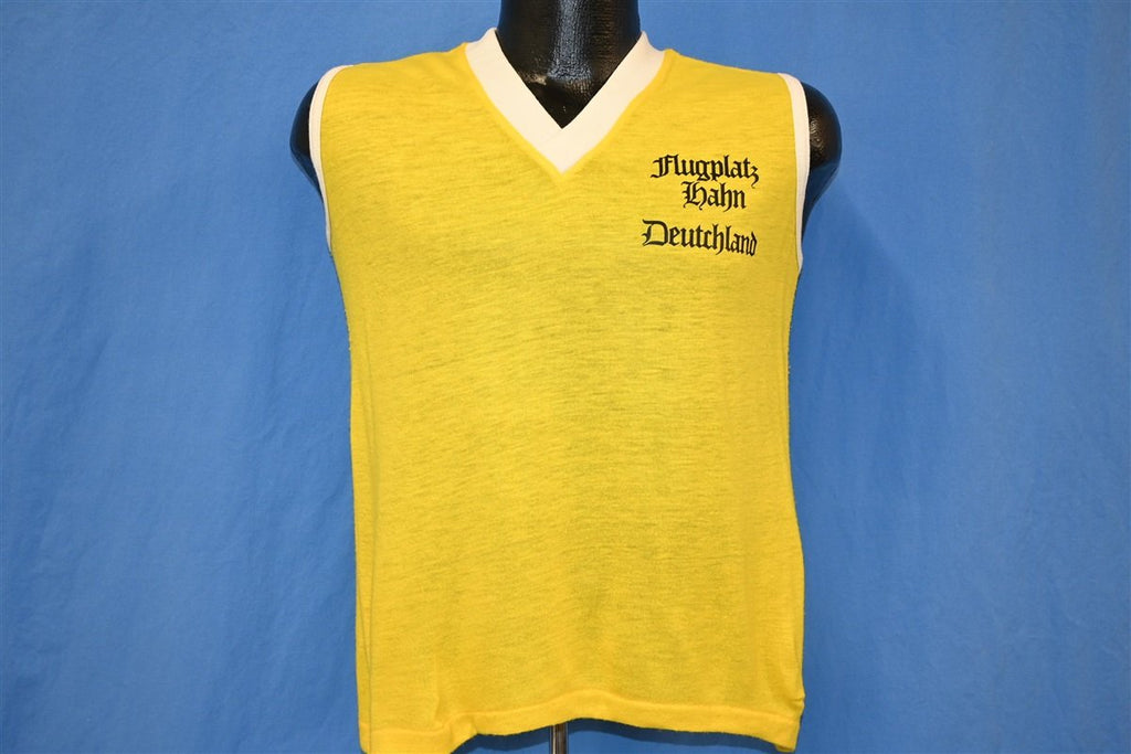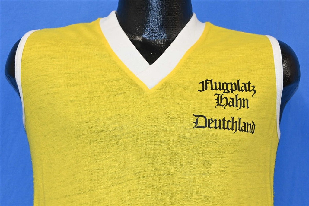 This tee is a keepsake from Hahn Highlanders Volkswanderung, a fitness walking event hosted by Hahn Air Base sometime in the 1970s. It's aged beautifully over time, featuring double sided print, a classic muscle tee fit, and one hundred percent Orlon acrylic.