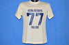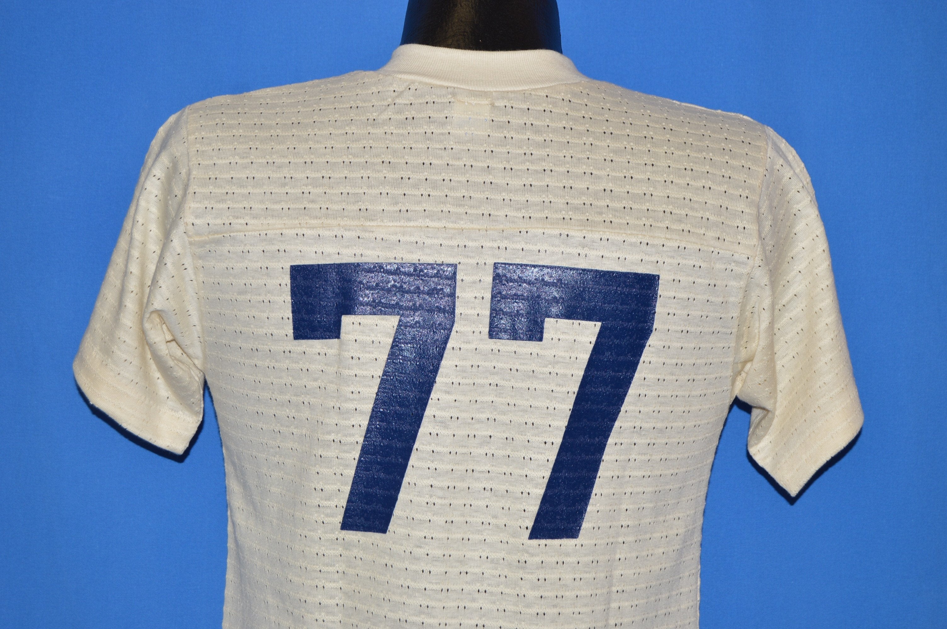 This white mesh shirt was made in the 70s and is from Siena Heights University in Michigan. The shirt features the text "Siena Heights College" across the front along with the graduating year "77" on both the front and the back of the shirt. This shirt is deadstock and has never been worn before!