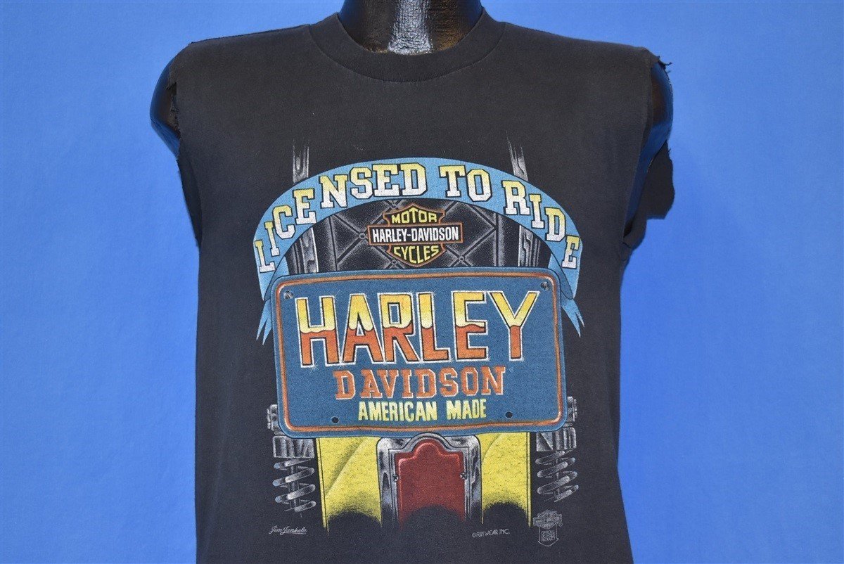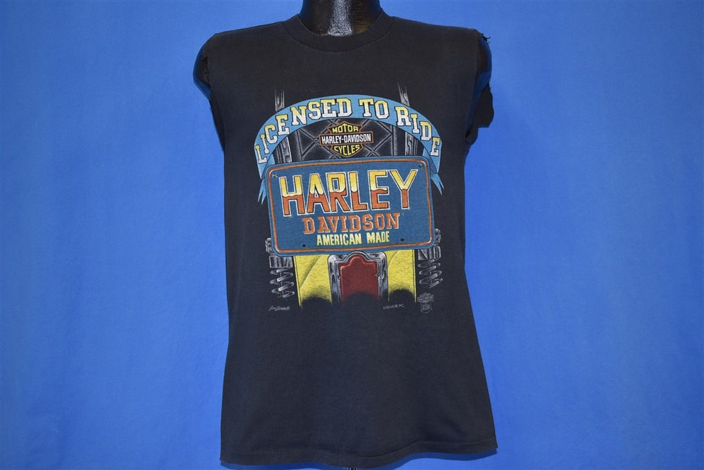 This vintage tee perfectly capture those rugged biker vibes. It's a 1980s original featuring classic Harley Davidson graphics, cut sleeves, and a sweet cotton blend.