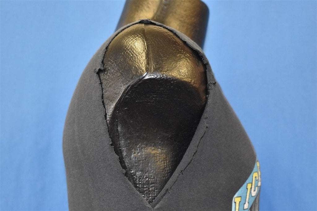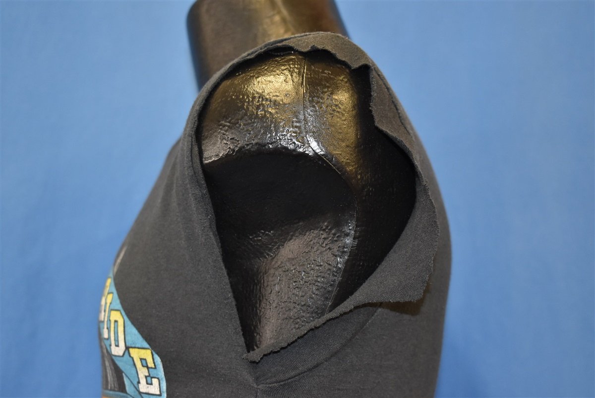 Fits like a modern unisex adult medium. Feels like a cotton blend. Sleeves are cut, see pics.