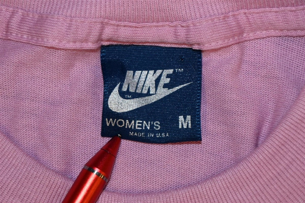 This shirt is the epitome of cool 80s fashion. Nike apparel took a step off the sports fields and onto the streets in the 1980s becoming an essential for all hip kids. The ability to transition from solely a sportswear brand to one of the most ubiquitous labels in clothing is a feat Nike is unique in accomplishing. This was partially due to the partnership Nike organized between Michael Jordan and Spike Lee in the mid 80s. Lee's character of Mars Blockmon, from She's Gotta Have It (1986), a hyper New York Knicks super fan obsessed with Air Jordans, was used frequently in Nike ads. This was the first time Nike represented their customers as not only active athletes but regular fans as well.