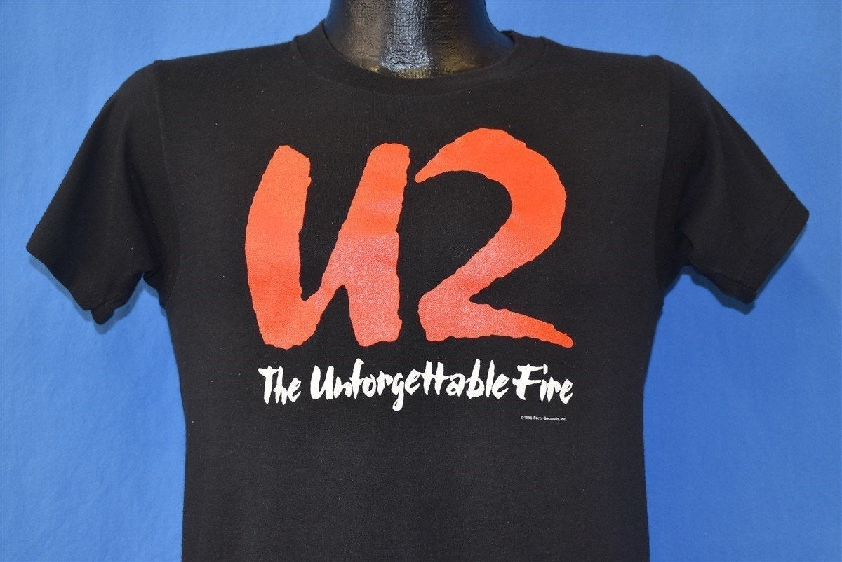 This double-sided band shirt is for U2 from their 1984 album The Unforgettable Fire. The band was looking to explore a different sound than the harder-hitting rock style of their previous album War. To do this, they employed producers Brian Eno and Daniel Lanois to help them explore a more ambient sound. The title The Unforgettable Fire was derived from an art exhibit centered around the atomic bombing of Hiroshima. The album featured the singles "Pride (In the Name of Love)" and the title track "The Unforgettable Fire".
