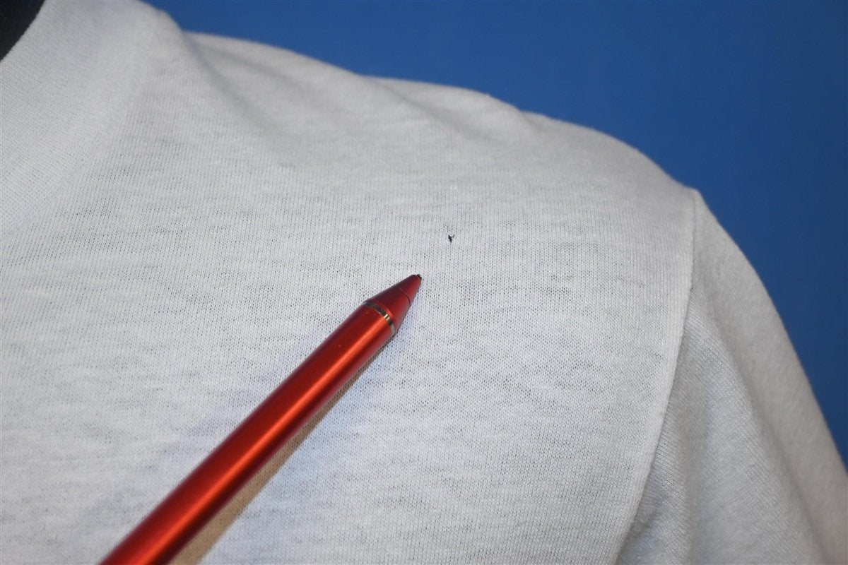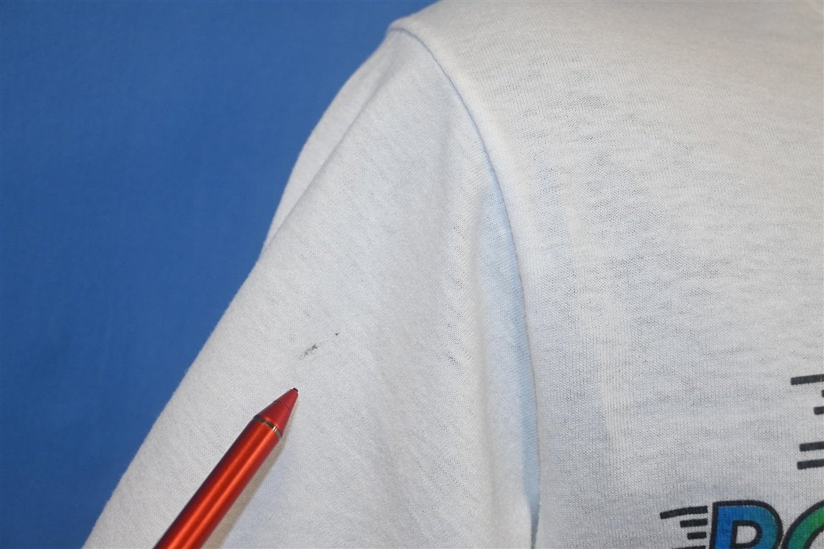 The tag says medium but this shirt fits like a modern unisex adult small. There are two tiny holes near the shoulder, see pics.