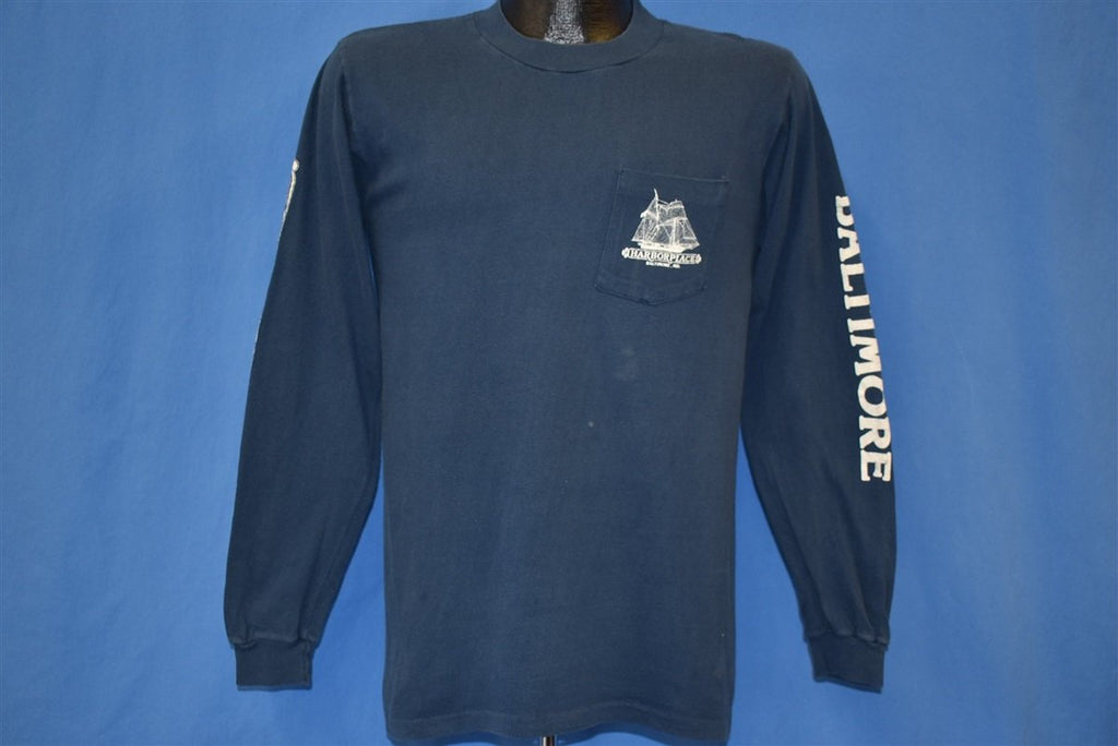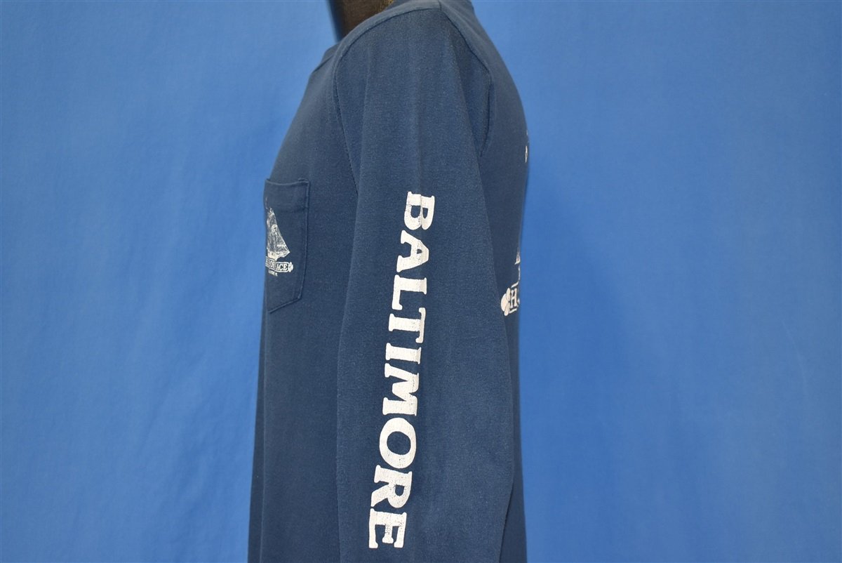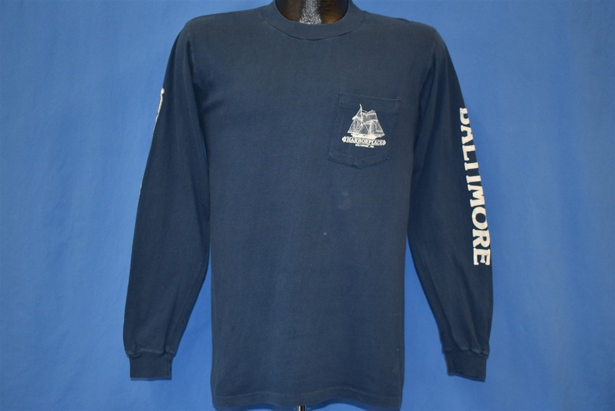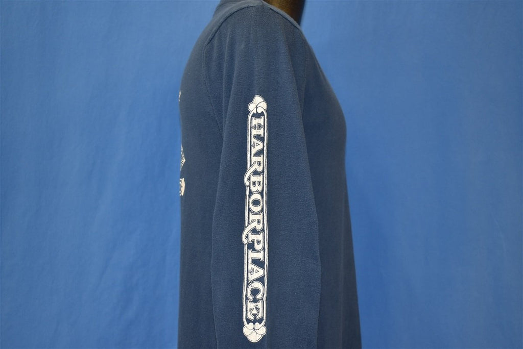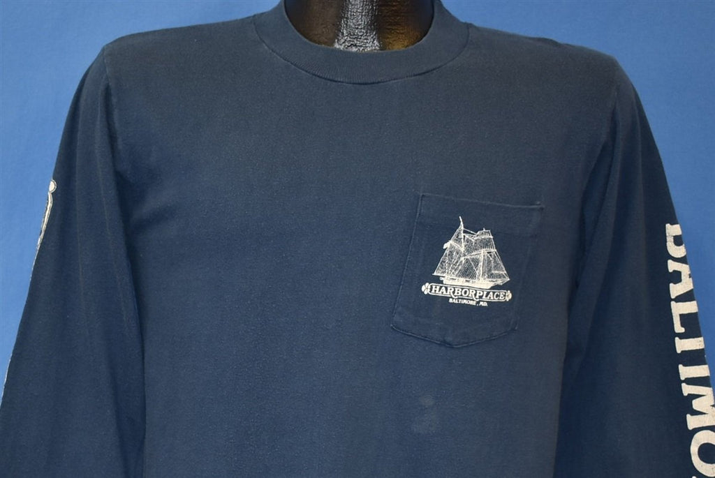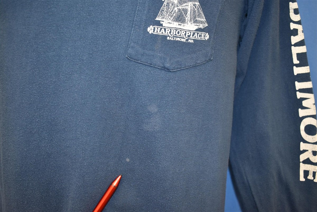This classic tourist tee is dedicated to iconic Harborplace in Baltimore, Maryland. It's a 1990s original featuring double sided print, cozy long sleeve, and a front chest pocket.