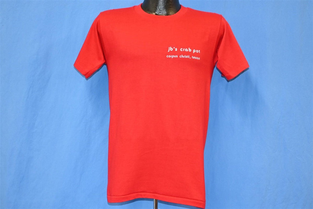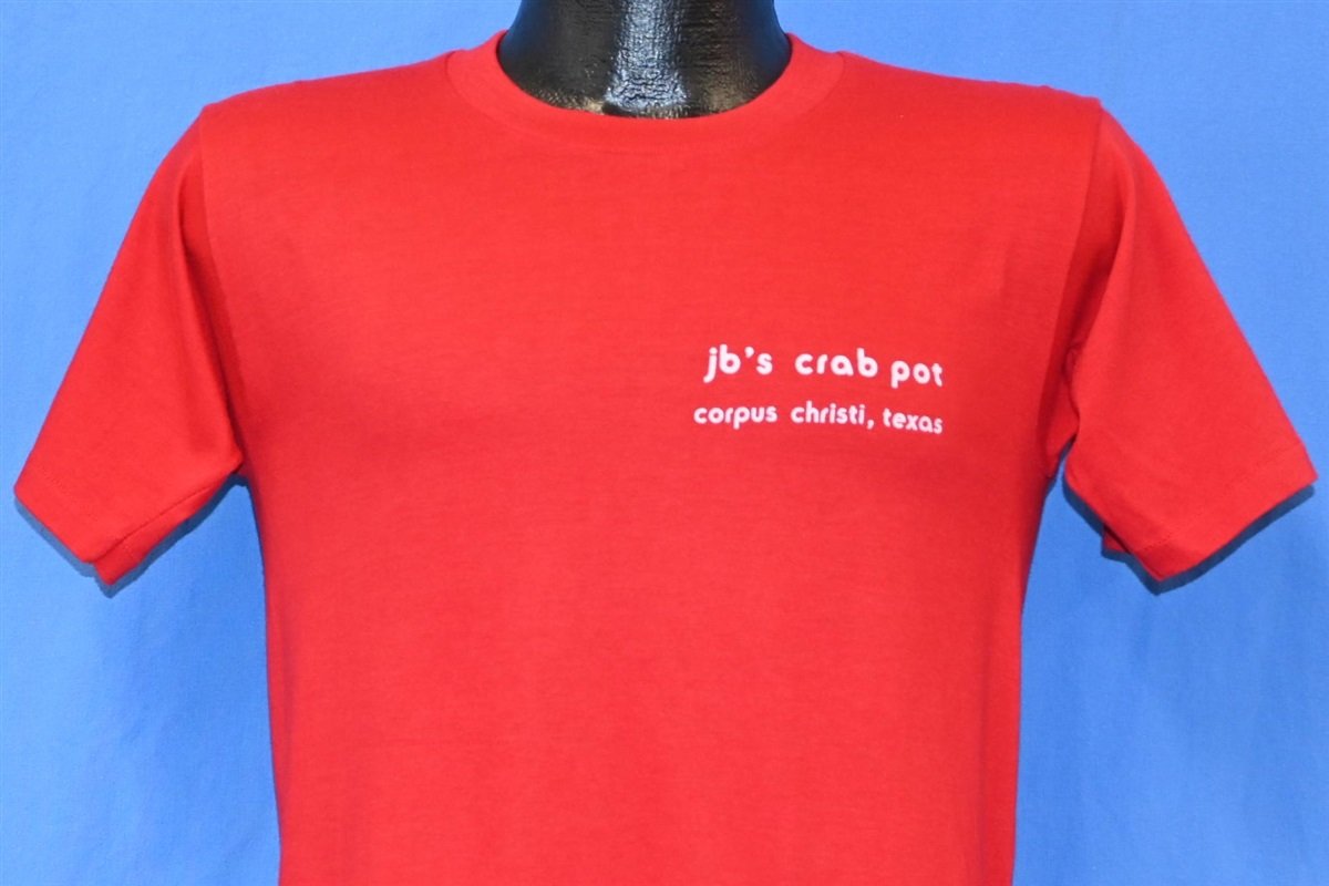 This bright red t-shirt features a small logo on the front for a seafood establishment called JB's Crab Pot. JB's was a beloved local restaurant that opened in Corpus Christi, Texas sometime back in the 80s. Reviews of JB's Crab Pot have praised the restaurant for its quaint atmosphere and delicious food. Apparantly none of the dishes at JB's matched, salads were served in mason jars and drinks in old jelly glasses, but no one could beat the restaurant's delicious seafood that was said to be flavored with a Cajun influence.