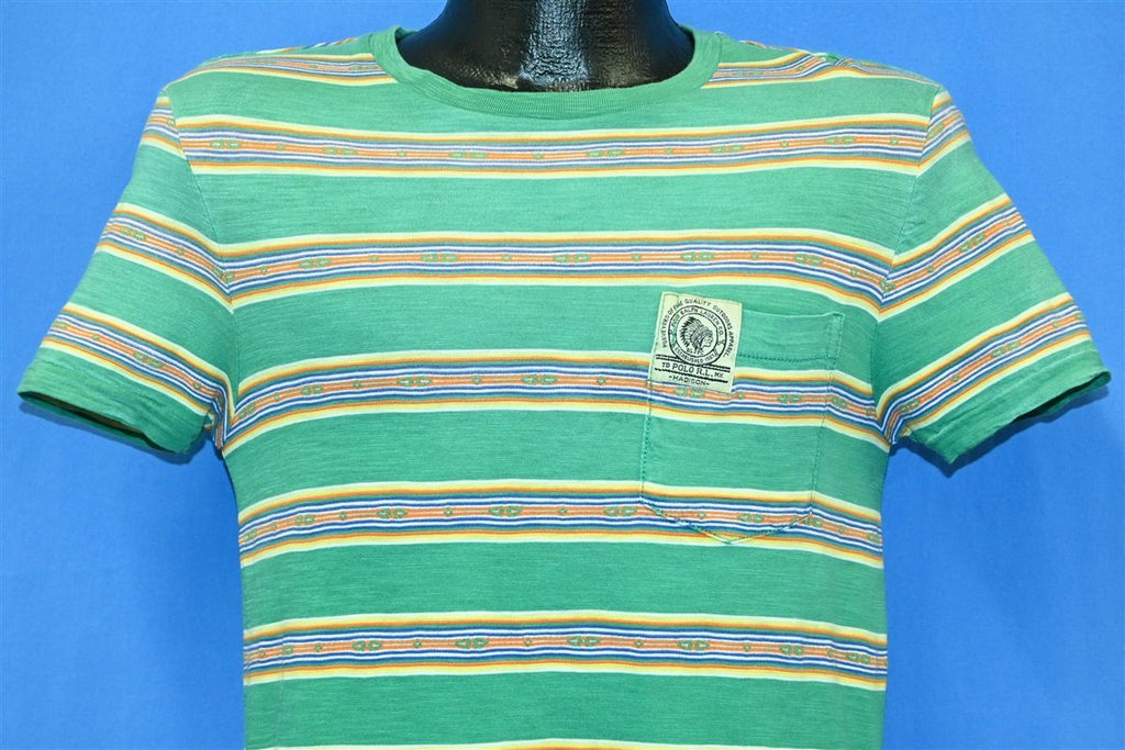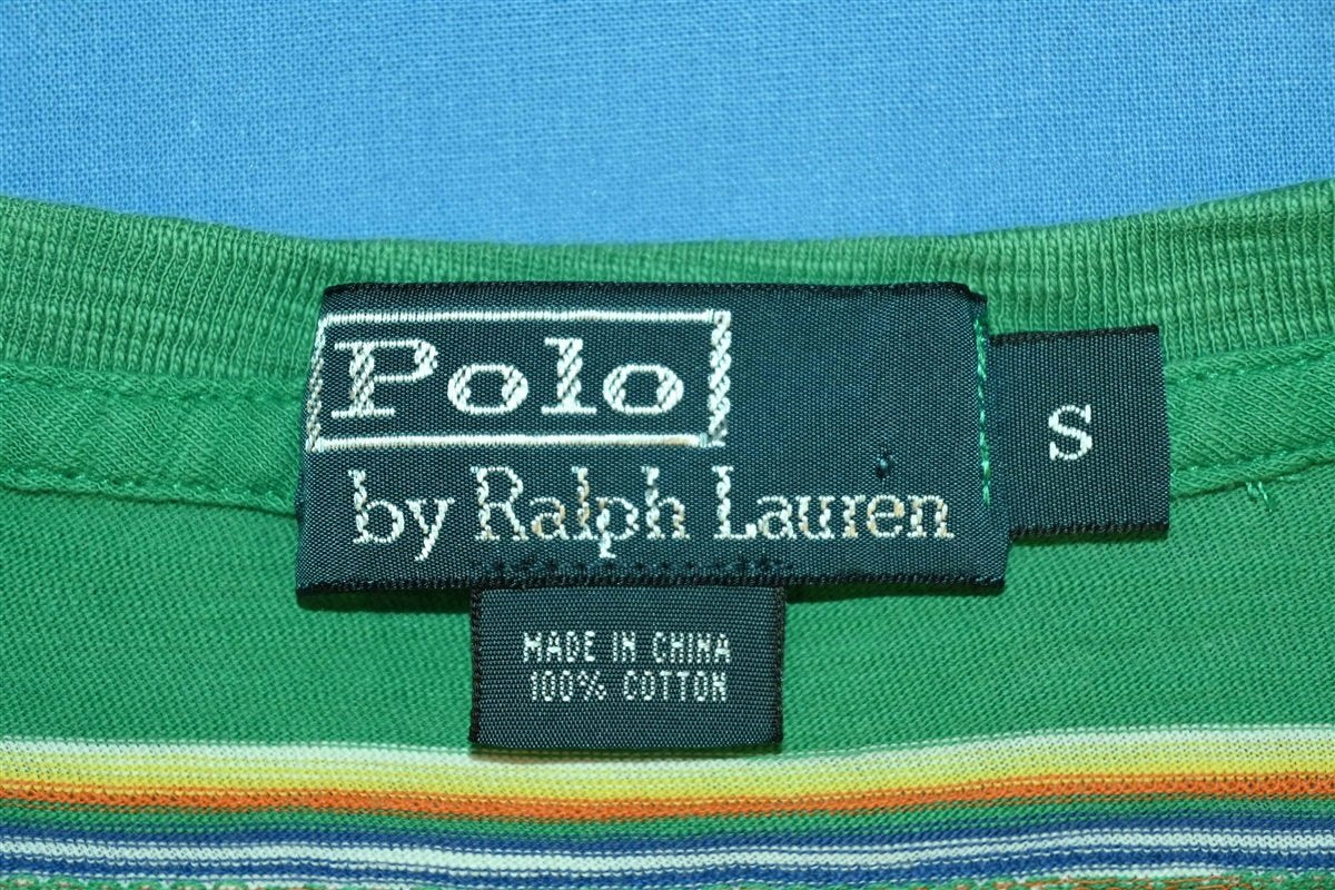 This awesome tee was made by Ralph Lauren back in the 90s. The shirt features multi-colored horizontal stripes and a single chest pocket that includes a Polo Ralph Lauren seal sewn onto it. The Ralph Lauren Corporation was founded in 1967 by its namesake Ralph Lauren, who was one of several influential designers that grew up in the Jewish community of the Bronx in New York. The company started out selling men's ties, but since the 60s has expanded into various apparel, home goods, accessories, and fragrances.
