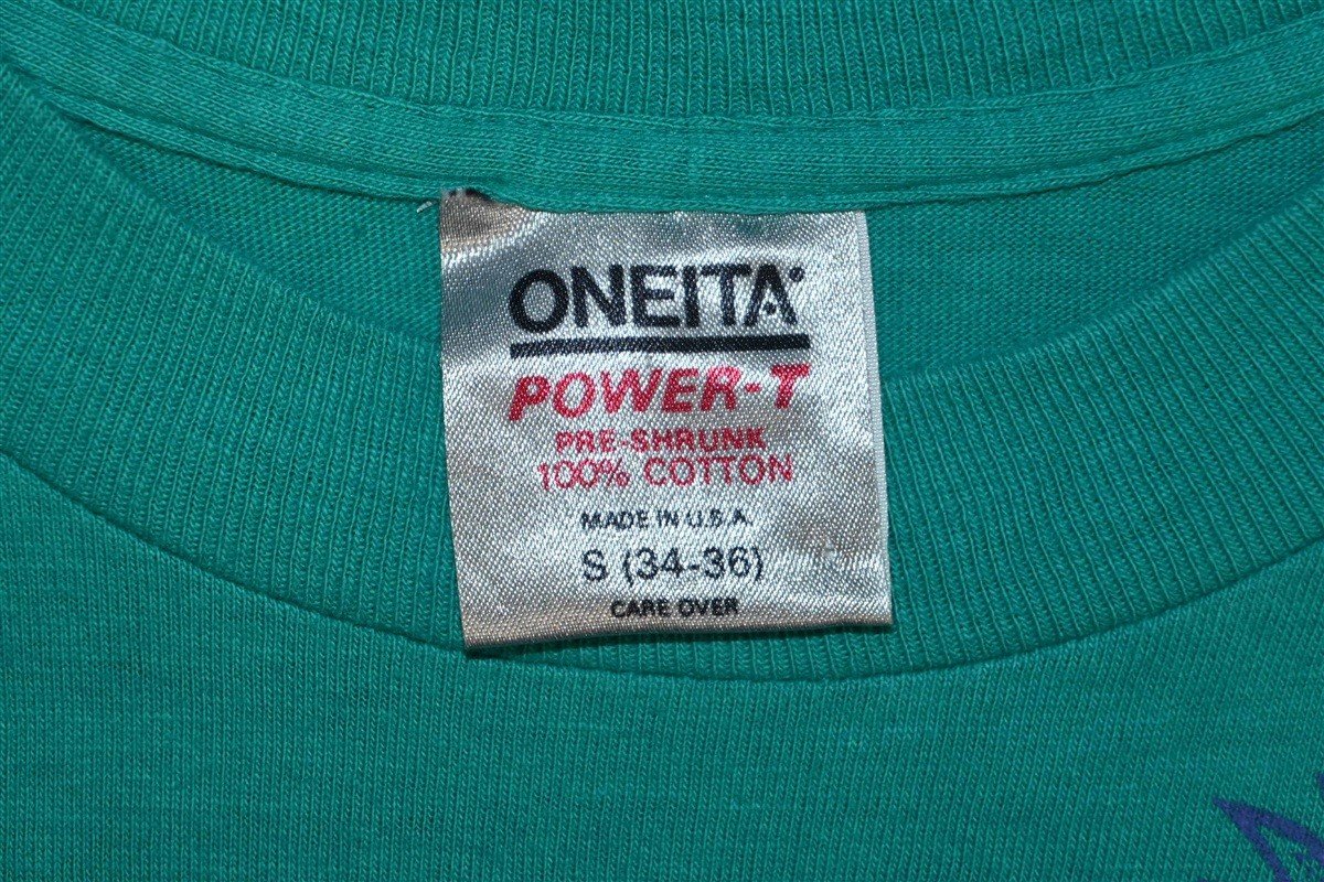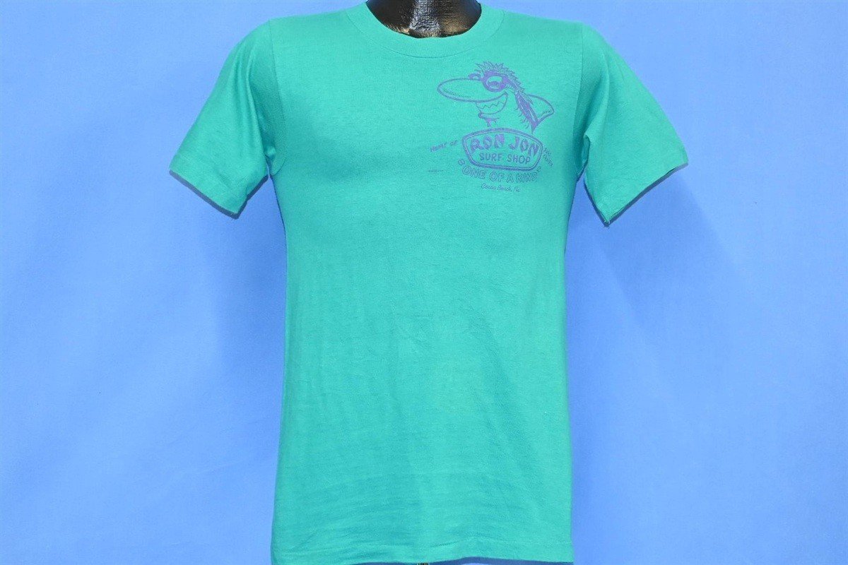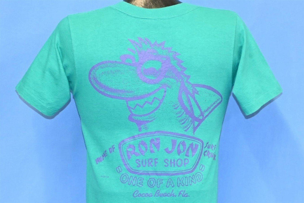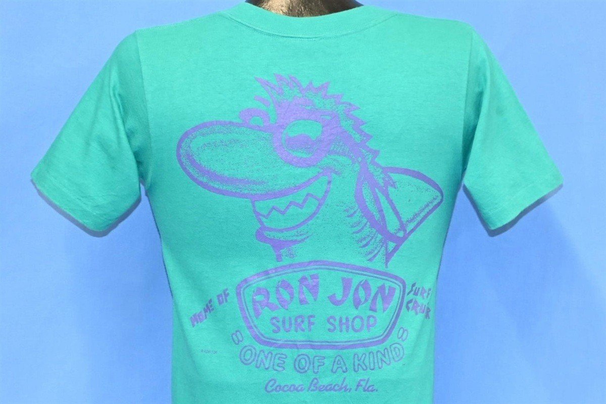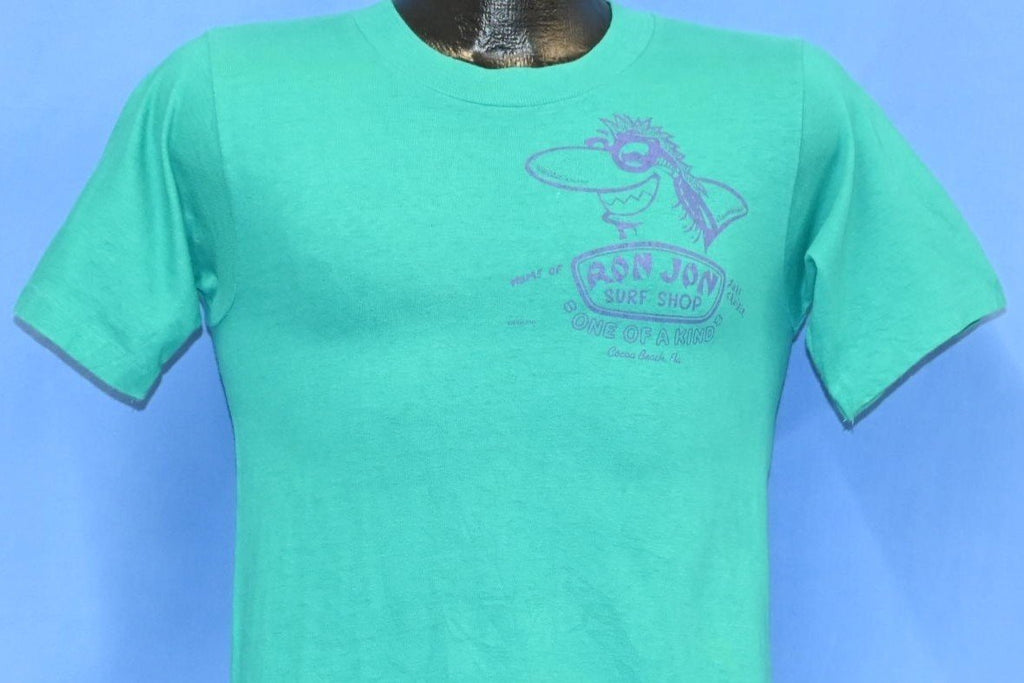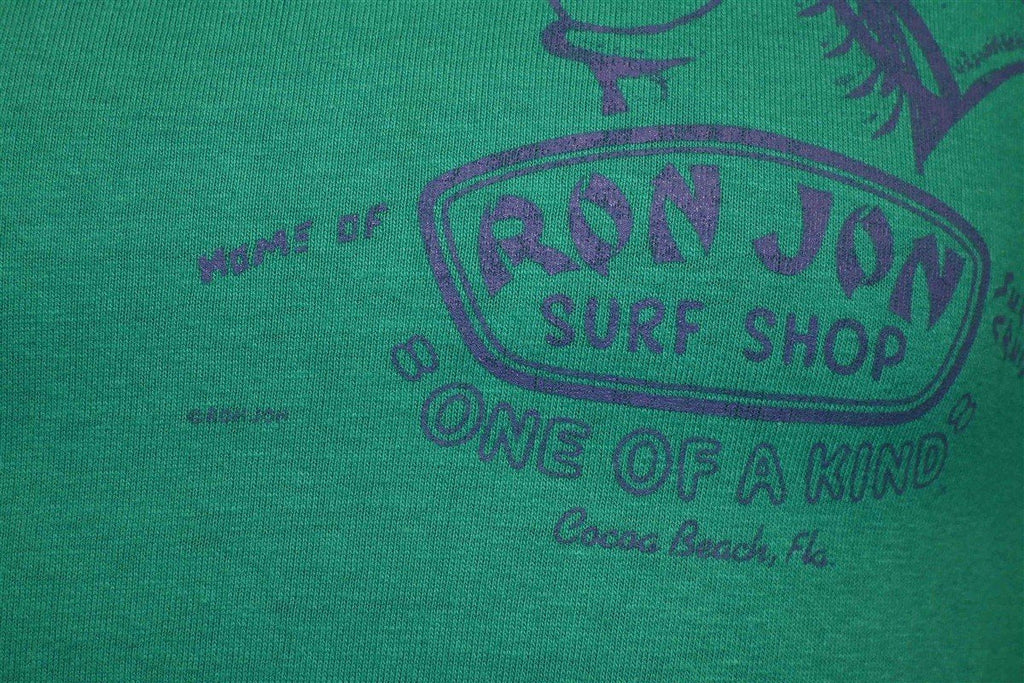 This sweet t-shirt promotes the surf shop Ron Jon in Cocoa Beach, Florida. Ron Jon Surf Shop was founded in 1959 on the New Jersey Shore on Long Beach Island. Years later Ron Jon opened up their flagship store in Cocoa Beach.  As the company grew they spread out with 13 new stores opening all along the East Coast. The Surf Shop sells everything one could possibly want from a beach trip. . The flagship store also holds over 52,000 square feet of space and a Surf Museum that shows the East Coasts surfing history.