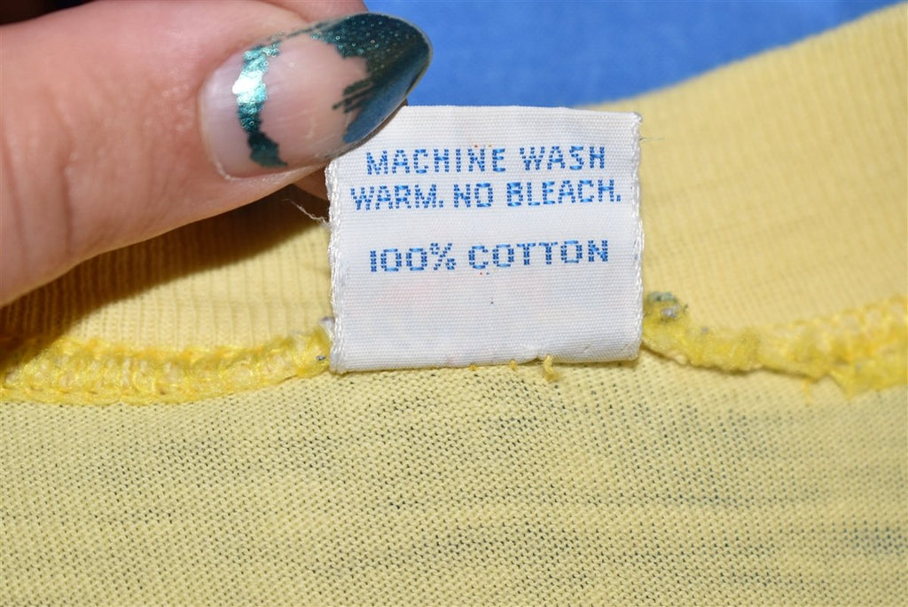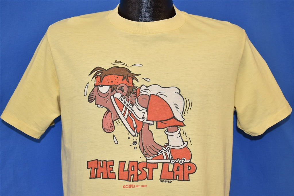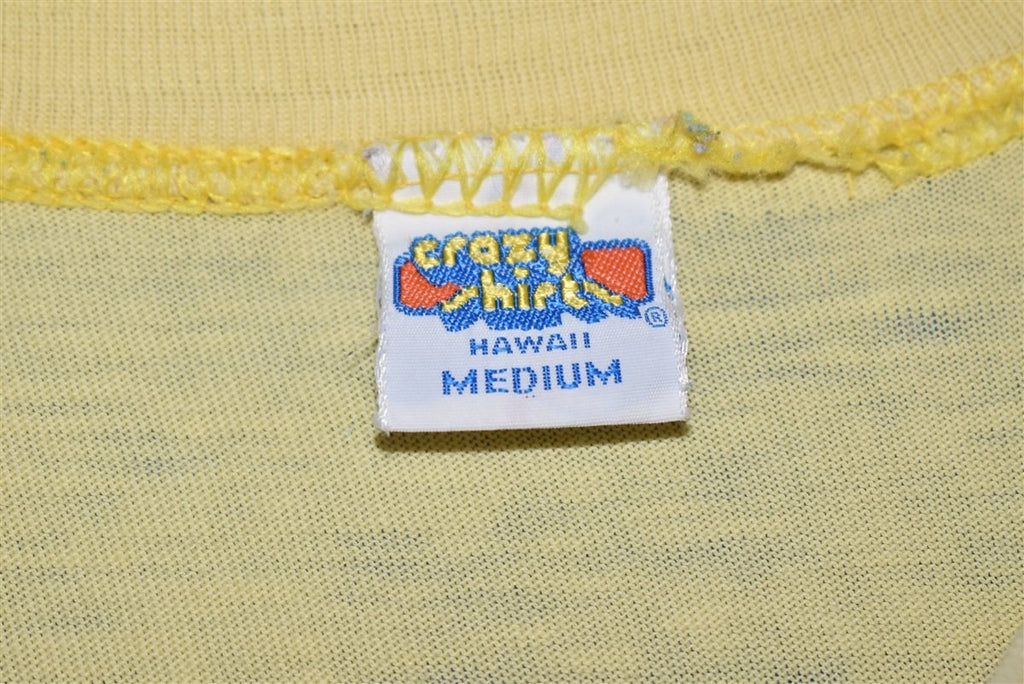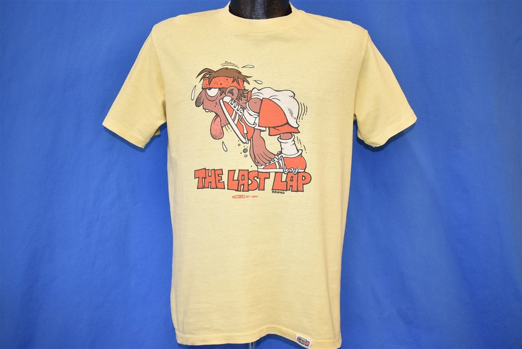 This silly cartoon tee from the 70s reads, "The Last Lap," showing a comically exhausted runner with his tongue hanging out of his mouth. This shirt comes from Crazy Shirts, a Hawaii-based brand that began in the 60s selling t-shirts to reflect the island lifestyle.