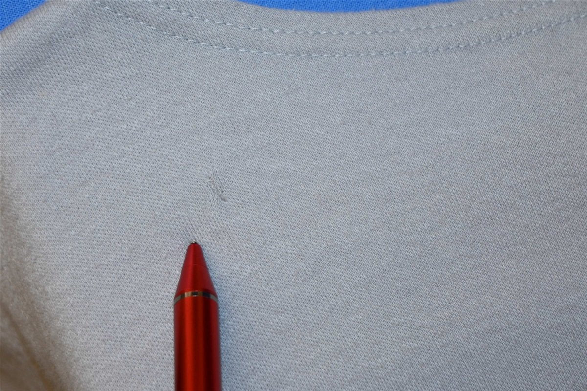 Fits like a modern unisex adult medium. There is slight discoloration on the front and a repair on the back of the left shoulder while wearing, see pics.