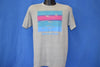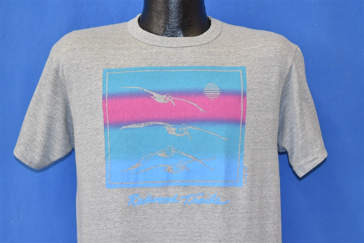 This colorful t-shirt is from Redwood Trails in Santa Cruz, California. Santa Cruz is known for their giant redwood trees, a species of evergreen trees known to grow massive in size and live up to 1800 years or longer. The image on the shirt shows several seabirds flying in front of a beautiful technicolor sunset. They're most likely brown pelicans who are known to inhabit the cliffs along the coast of California.