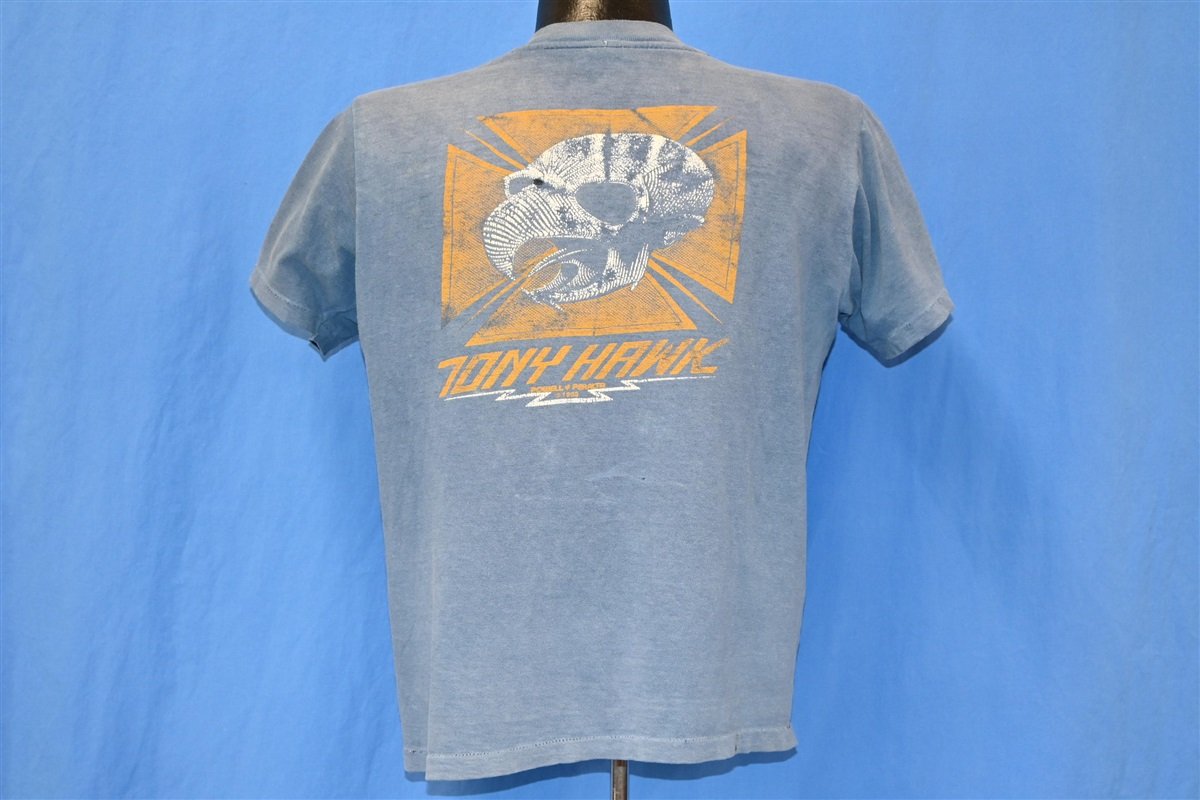 This amazing vintage skate tee promotes arguably the most famous professional skateboarder of all time, Tony Hawk. This shirt is a rare find from the early days of Hawk's career in the 1980s. Tony Hawk became a professional skateboarder when he was only 14 years old and during his early days he was sponsored by the skateboarding company Powell Peralta. Hawk was a member of the legendary Bones Brigade, the skate team which rode under the Powell Peralta banner, and he performed in several of co-founder Steve Peralta's influential skate videos, including the iconic The Search for Animal Chin.
