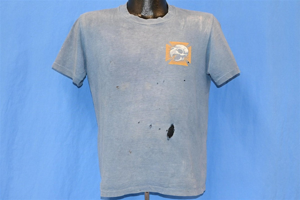 Fits like a modern unisex adult medium. This shirt is faded with several holes on both sides, see pics.
