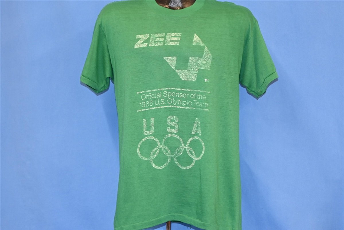 This unique tee is from an official sponsor of the 1988 U.S. Olympics Team. Due to the marketing success of the Los Angeles Olympics in 1984, the 1988 Olympics had exceeded the marketing expectations for sponsors. Many of the largest corporations were national sponsors including Philips, Coca-Cola, Time, Kodak, 3M and Visa. This tee is for a company that little is still known about, called Zee+ or Zee Plus. The 1988 Olympics took place in Seoul, South Korea.