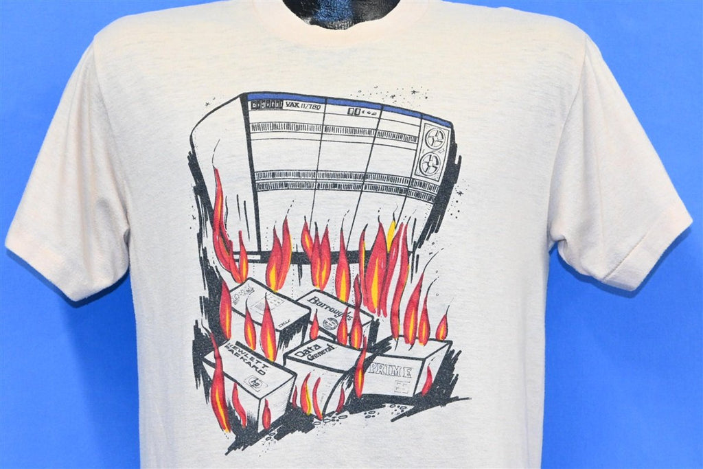 This cool tee was made for tech enthusiasts, particularly fans of the VAX-11/780 system. This shirt comes from the 1983 DECUS US Symposium held in Las Vegas, and it looks to have been made specifically for a Tucson Users Group, who were attending. It's safe to assume this local user group might have been a part of the VAX SIG, as this shirt features some cheeky double-sided graphics that are designed to promote the superiority of the VAX family of computers. The front shows the VAX-11/780 looming over its burning competition, including systems from Burroughs, Hewlett Packard, IBM, Data General, and Prime. Meanwhile the back reads "VAX Vobiscum", a play off the latin phrase, "pax vobiscum", which means "peace be with you". Instead this shirt intends to bear the message "VAX be with you".
