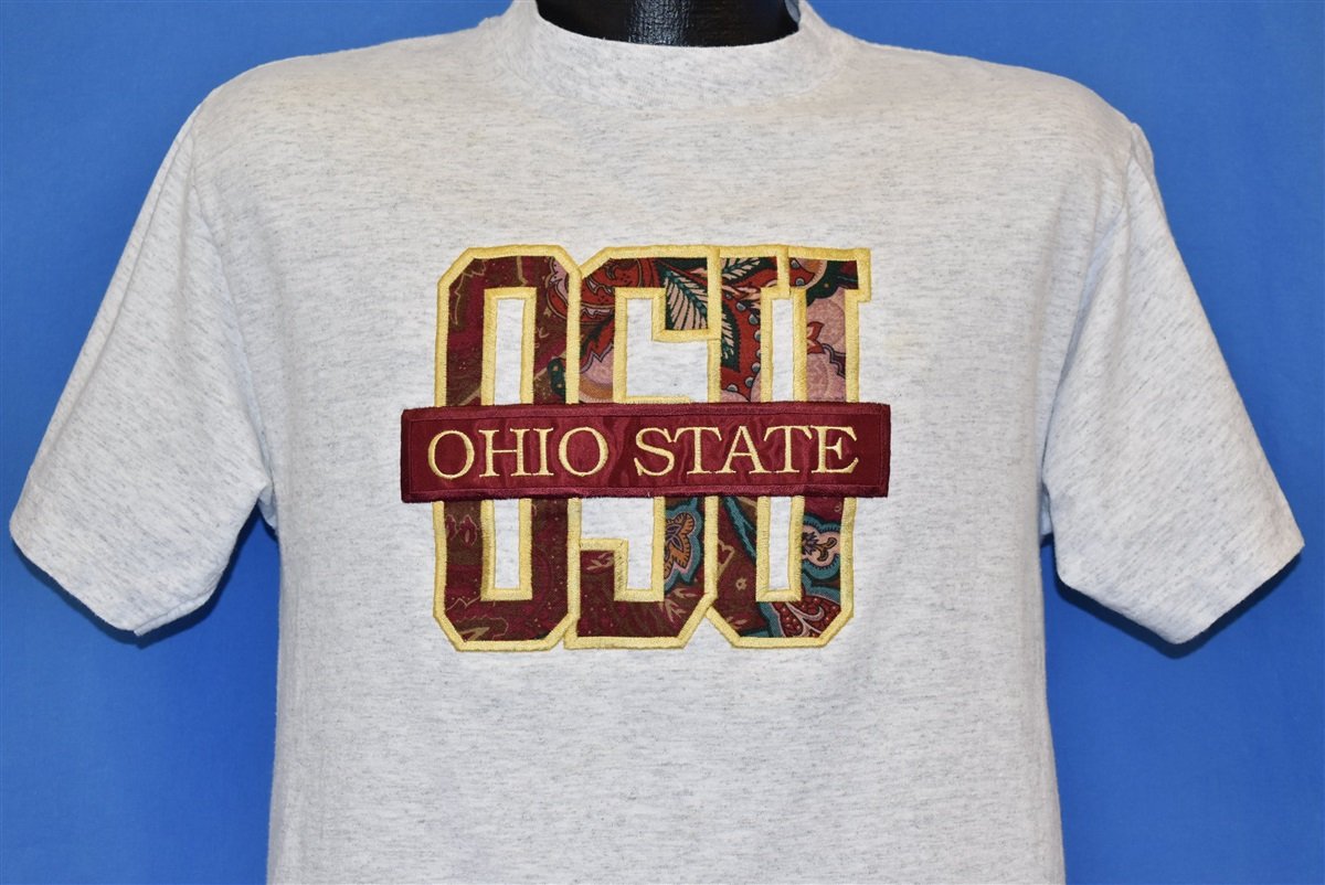 This vintage college tee features a paisley embroidered graphic for Ohio State University, home of the Buckeyes. OSU is a public university located in Columbus. It was originally founded in 1870 as the Ohio Agricultural and Mechanical College. The Buckeyes, who are named after the Ohio state tree, compete in NCAA Division I sports as members of the Big Ten Conference. As of the 2016 Summer Olympics , 104 Olympic medals have been earned by athletes from Ohio State.