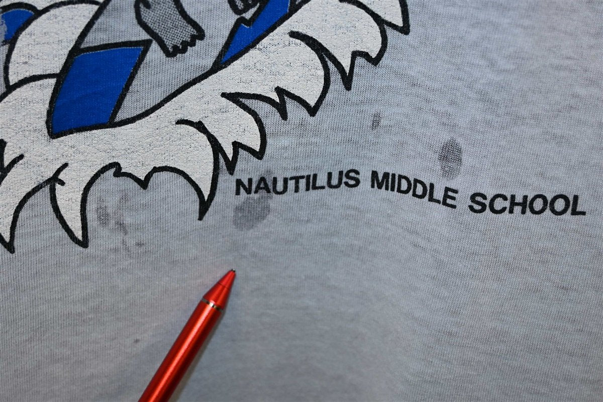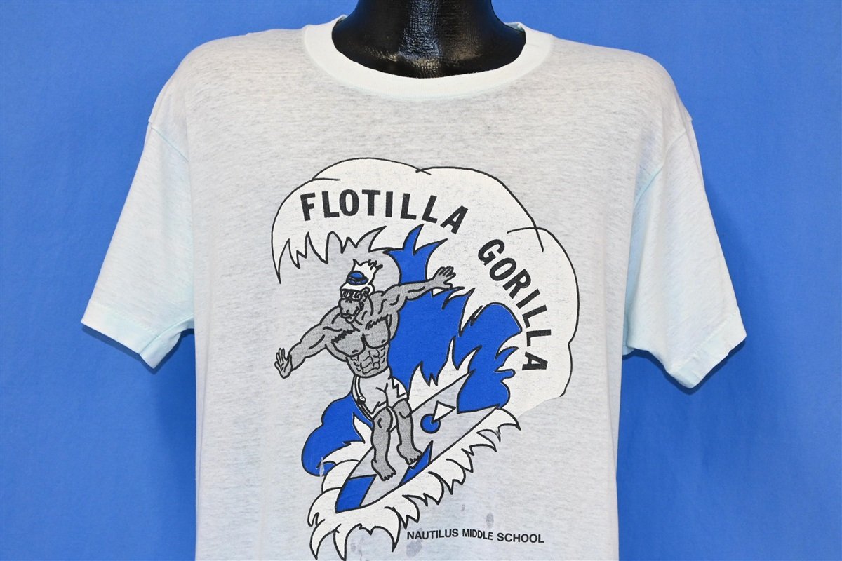 This vintage school shirt was made back in the 80s to rep Nautilus Middle School. Nautilus Middle is a public school found in Miami, Florida and it's a part of the Miami-Dade County School District. Although Nautilus is proudly home of the Sharks, this shirt features a goofy cartoon graphic of a surfing gorilla with the caption "Flotilla Gorilla", and this tee may have been from a school event or fundraiser.