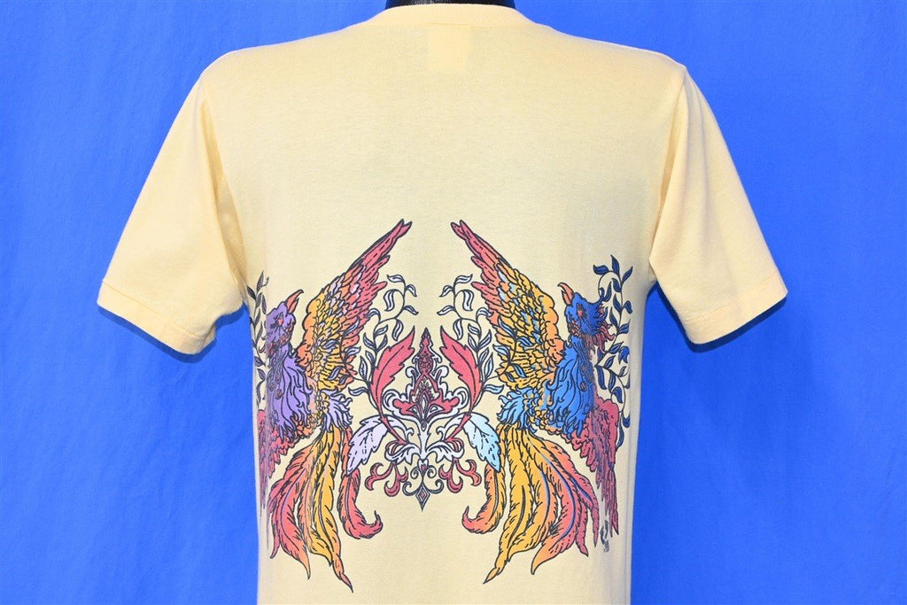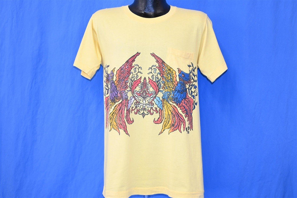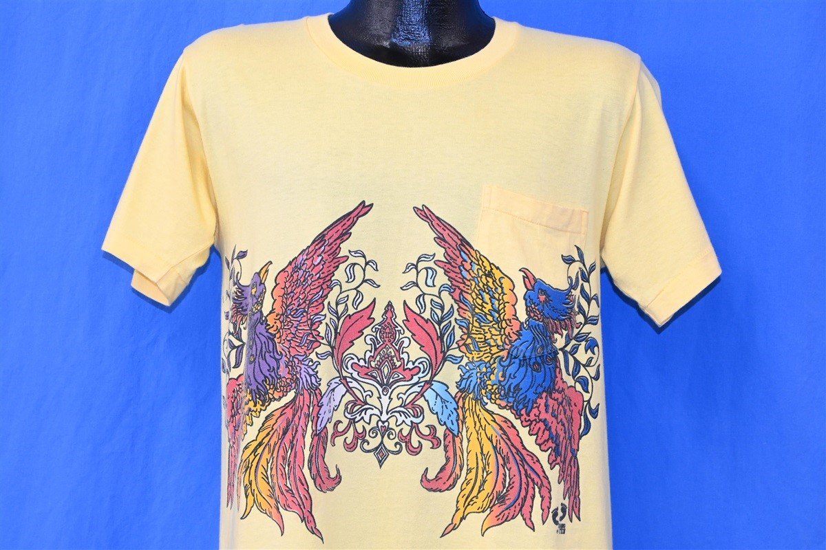 This rad, vintage Hang Ten tee features a wrap-around graphic of colorful, detailed phoenixes surrounded by floral motifs. The graphics are stunningly vibrant against the soft yellow of the cotton shirt. There's also a chest pocket on the front on the right side.