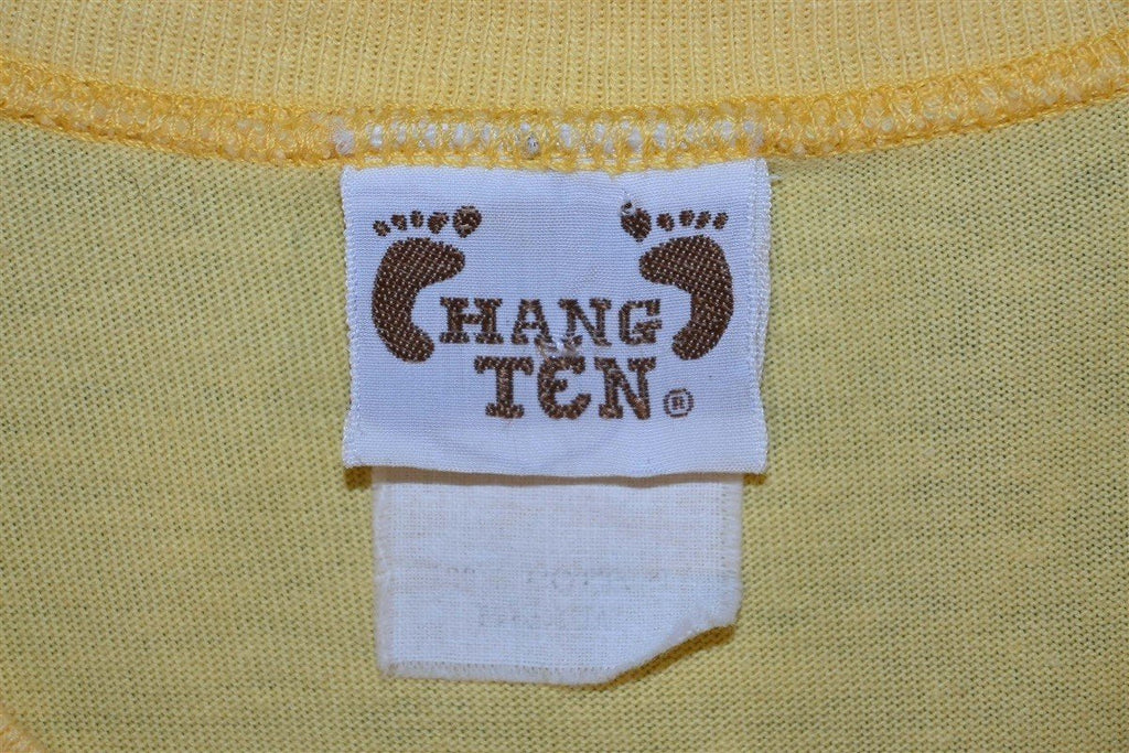 Hang Ten is a surf wear clothing company that was founded in 1960 by Doris Moore and Duke Boyd in Seal Beach, California. They aimed to create a clothing brand that encapsulated the California surf culture of the time. They started out by producing board shorts designed to withstand the wear and tear of the waves and later moved on to other products, like t-shirts and surf accessories. The brand's golden, embroidered bare feet logo quickly became iconic and appeared in the cheeky Hang Ten advertisements that were often on the inside cover of Surfer Magazine.