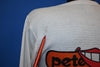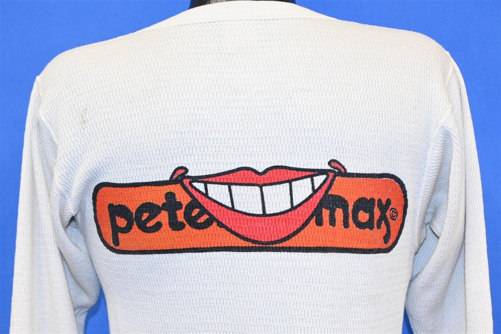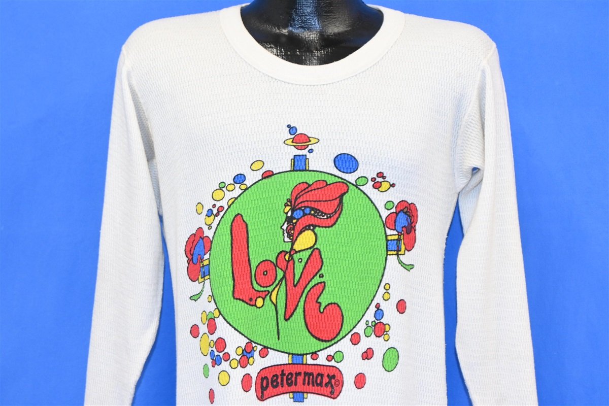 This cozy, waffle knit thermal was made back in the 1970s, and it showcases the artwork of Peter Max. Max was born to Jewish parents in the city of Berlin, Germany in 1937. His family fled to Shangai, China during the war, and Max's childhood in China helped to influence his later work, particularly the bright colors and fantastic forms he witnessed at the Buddhist temple across the street from his home. Max's family continued to move around throughout his adolescence, before settling in Brooklyn, New York. Max later attended the Art Students League of New York, where he studied under the illustrator Frank J. Reilly.