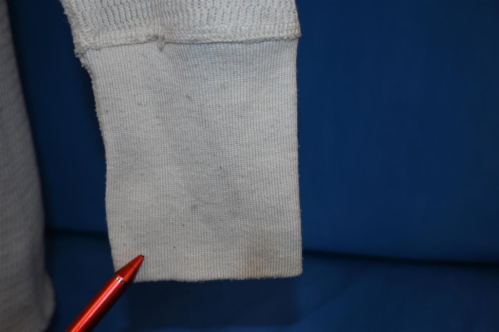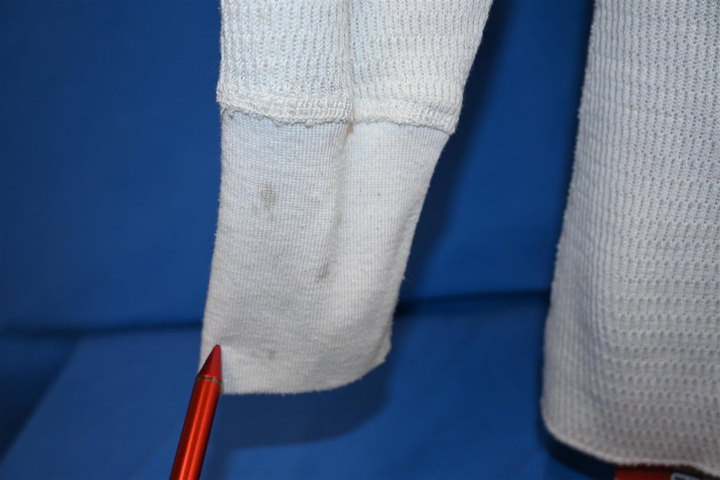 The tag say tall XL but this shirt fits like a modern unisex adult medium. It is made out of a stretchy waffle weave material. There is a spot on the back of the left sleeve and on the right cuff when wearing, see pics.