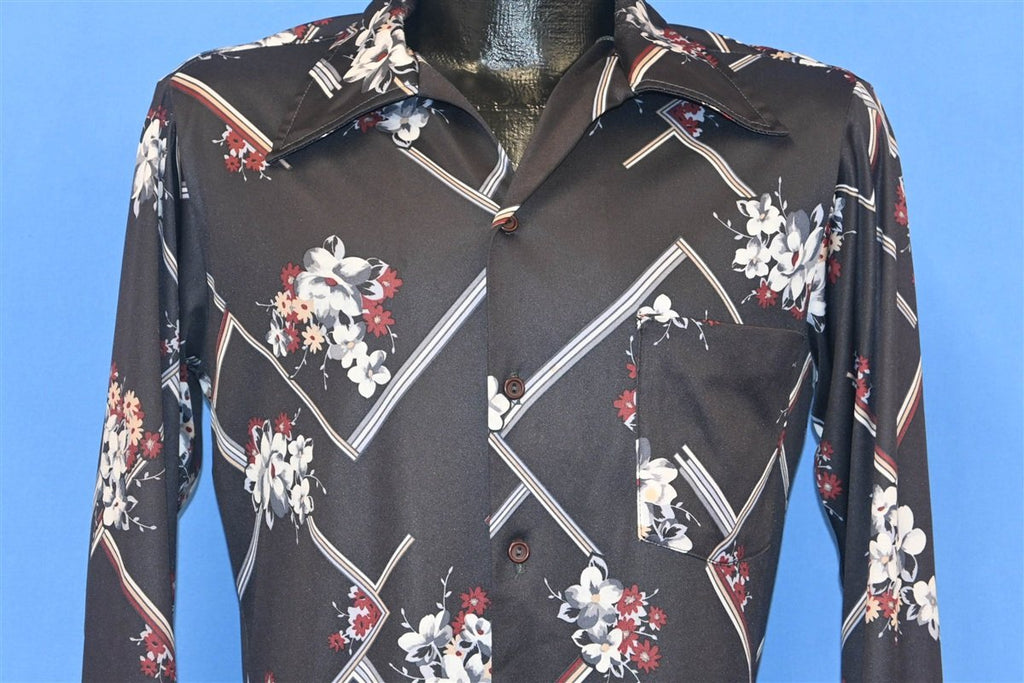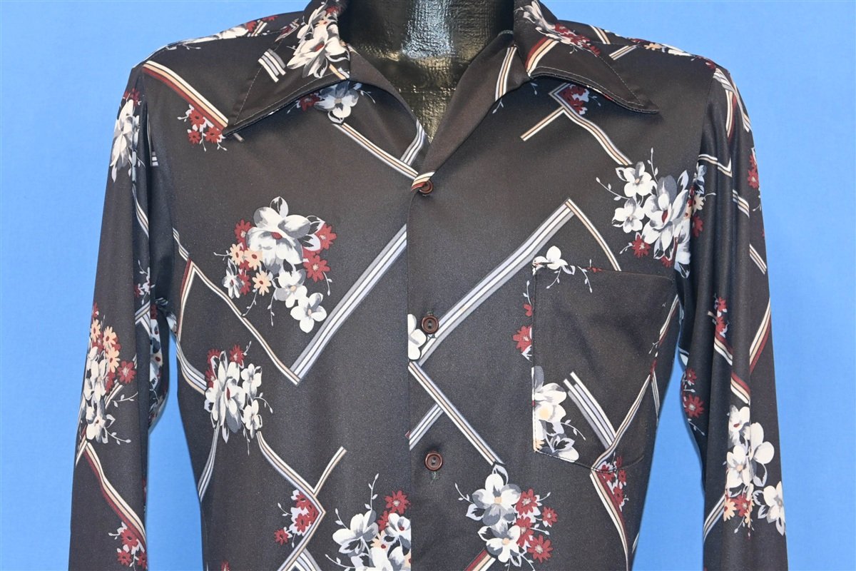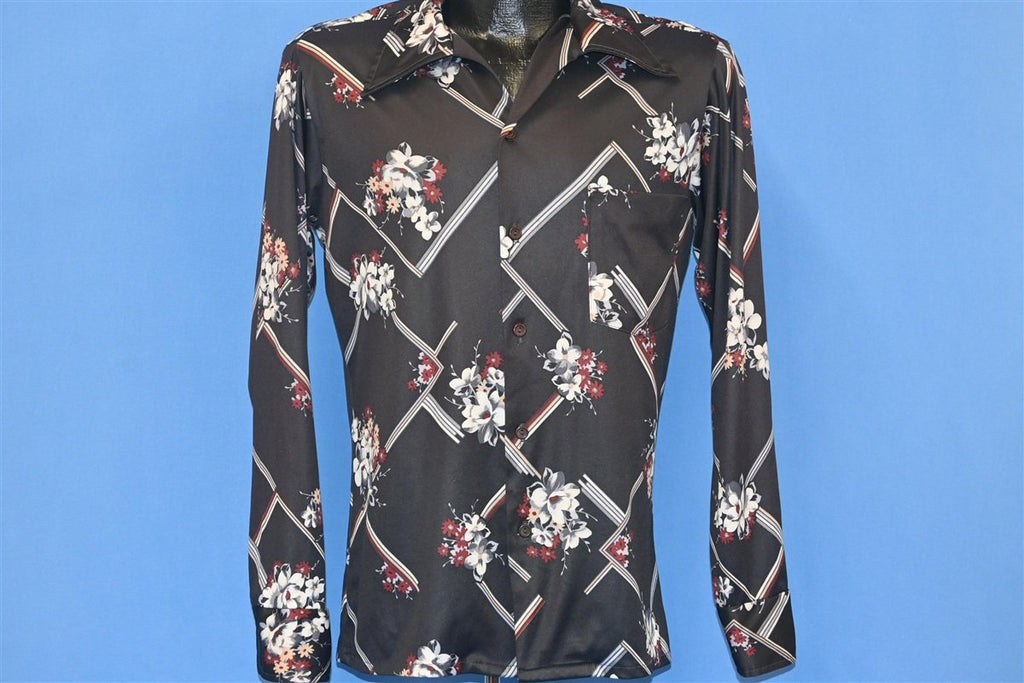 70s Stuart Mann Brown Floral Polyester Disco Shirt Medium