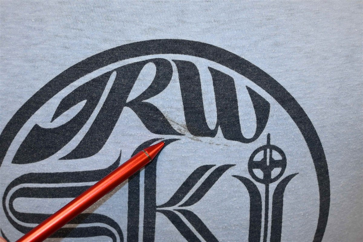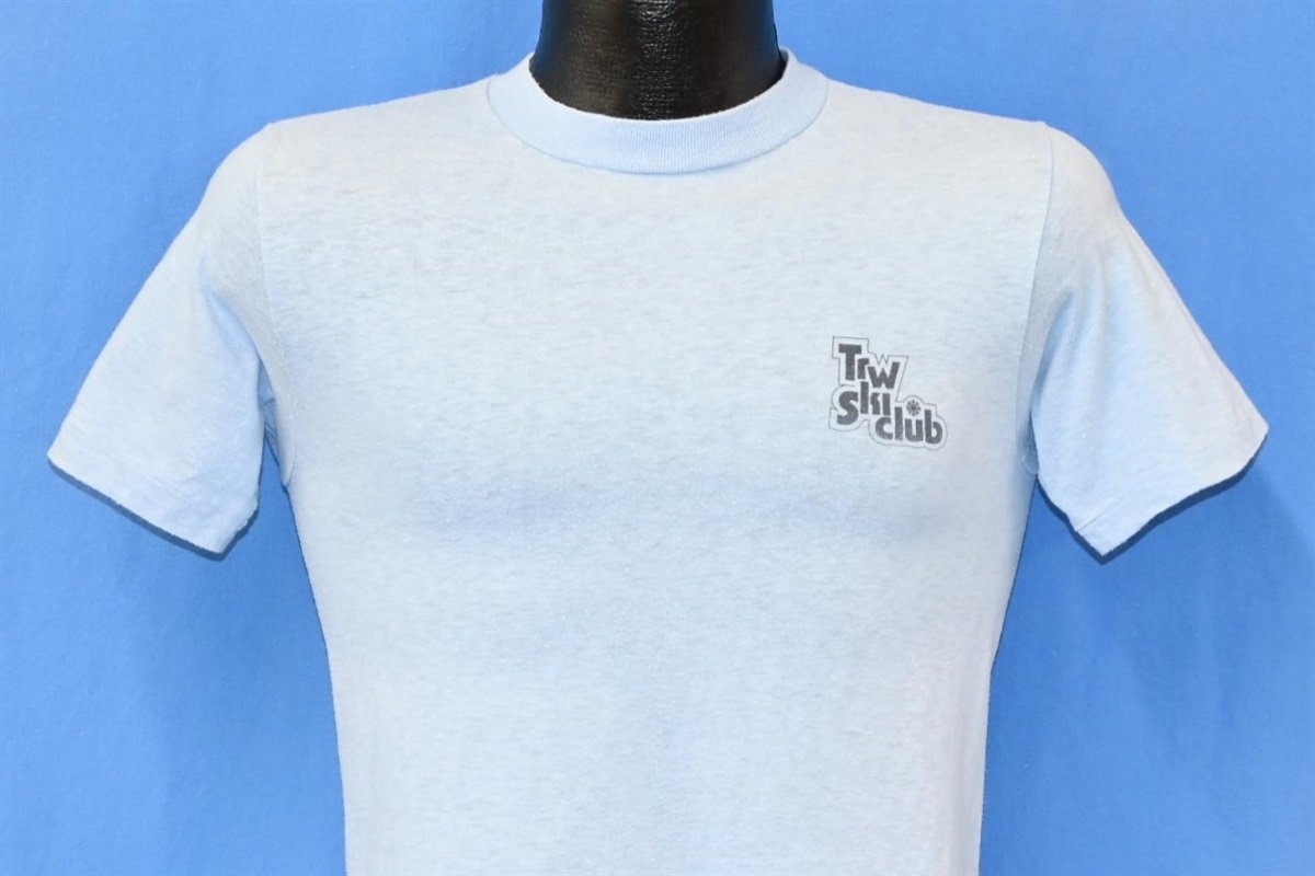 This cool graphic tee is from the TRW Ski Club in California. It features the club's logo on the back and a small graphic on the left chest. The club was founded by ski enthusiasts who worked at TRW in the 50s. TRW was a large corporation during the 20th century that was mainly involved in automotive and aerospace business ventures. At the height of its success, TRW engineers were working with NASA and the US Air Force. In 2000, the TRW Ski Club changed their name to The Right Way Ski Club shortly before the corporation was acquired by Northrop Grumman.