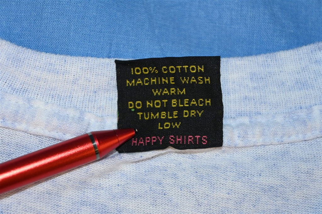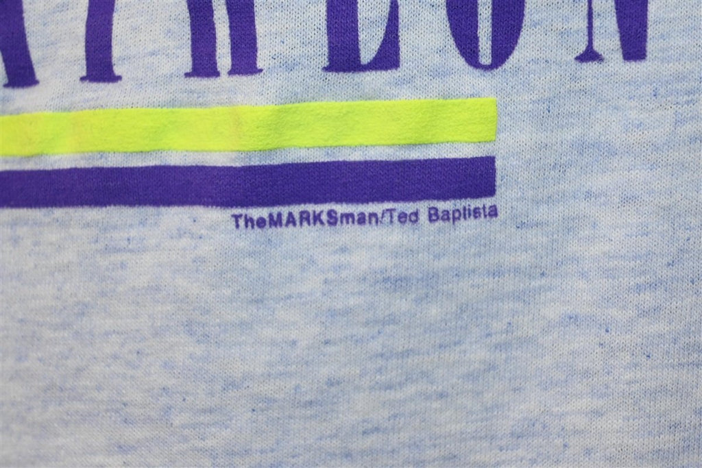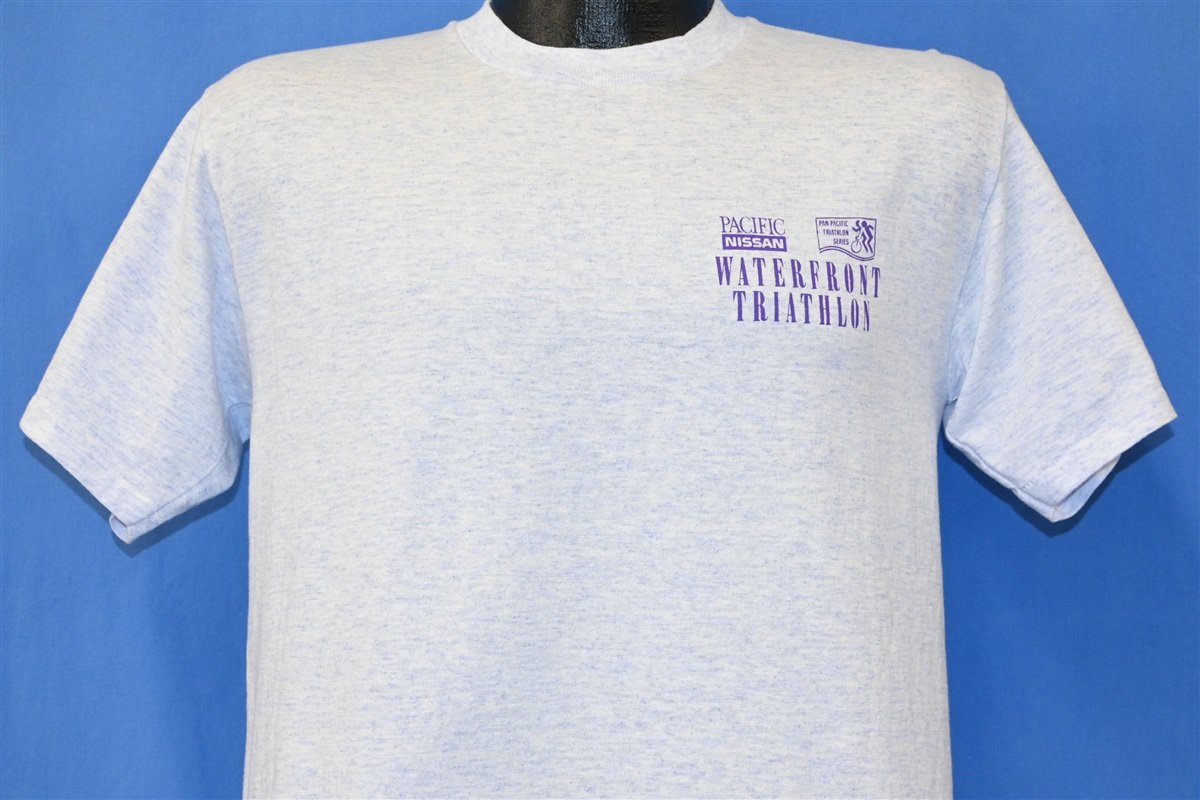 This sweet vintage tee is from the 1991 Honolulu Waterfront Triathlon. This run was a part of the Pan Pacific Triathlon series and it was sponsored by Pacific Nissan dealership. This tee was made by the Hawaiian based apparel company Gecko, and it features double-sided graphics and neon puffy paint.