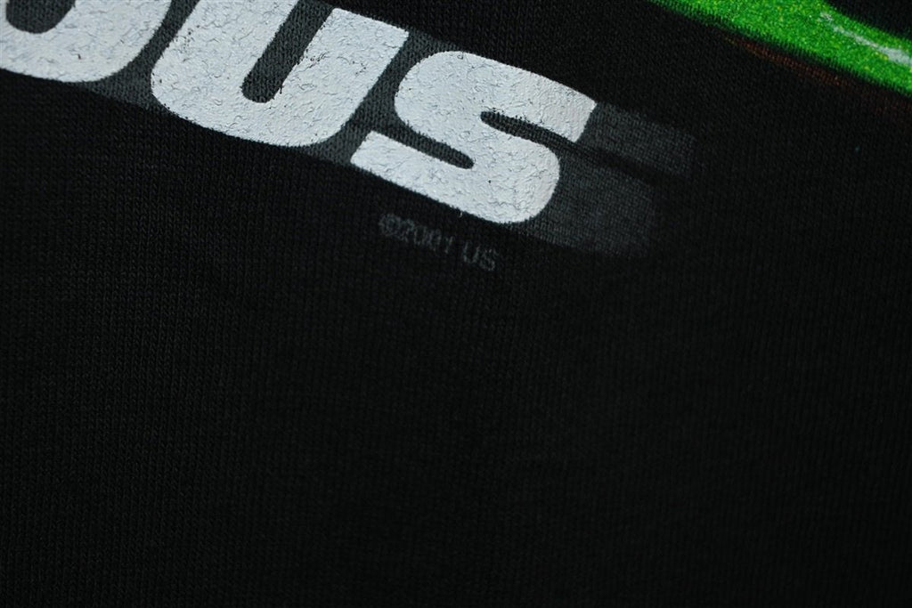 This amazing tee is a piece of original promotional merchandise for the 2001 action flick The Fast and the Furious. Despite receiving  mixed reviews from critics, The Fast and the Furious wound up giving birth to one of the most iconic and highest-grossing action movie franchises of all time. The original film was based off an article in Vibe magazine titled, "Racer X", and the story centered on an undercover cop who becomes embroiled in the world of illegal street racing. The movie starred Paul Walker in what was considered the breakthrough role of his career, and also featured Vin Diesel, Michelle Rodriguez, Jordana Brewster, and Rick Yune.