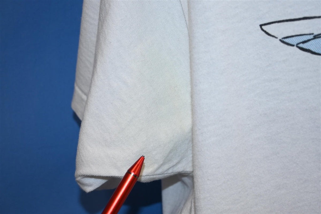 Fits like a modern unisex adult Extra Large. There are light spots on the front and sleeve, see pics.