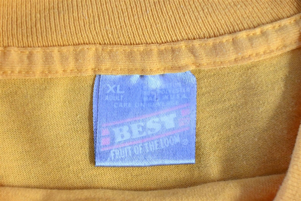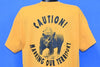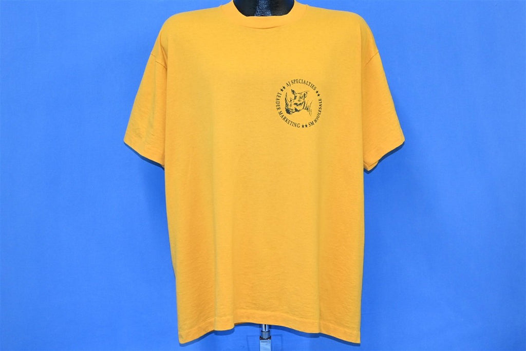 This bright yellow vintage tee looks to be advertising a business called AJ Specialties. The front also mentions Leader Marketing and SM Wholesale. While there's not a lot of information surrounding the origins of this tee or the business it came from, this shirt features some awesome rhinoceros graphics. This includes a large graphic on the back that says, "Caution! Marking Our Territory".