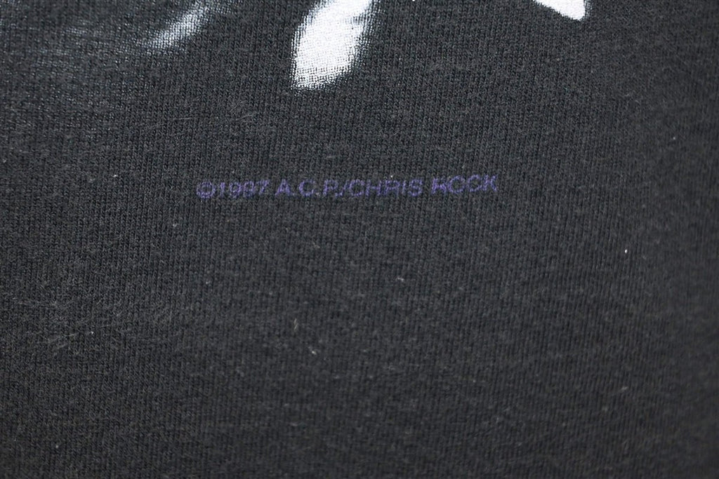 This sweet double sided shirt commemorates a stand up comedy tour from the celebrated actor and comedian, Chris Rock. This shirt features the same portrait of Rock that was used for the cover of his 1997 comedy album, Roll with the New. The album featured live material that was also included in his HBO television special Chris Rock: Bring the Pain, and the 1996 special effectively launched the comedian to super stardom. Prior to that he had gained attention as a cast member on Saturday Night Live, but after he was dismissed from the show in 1993, Rock struggled to maintain notoriety.