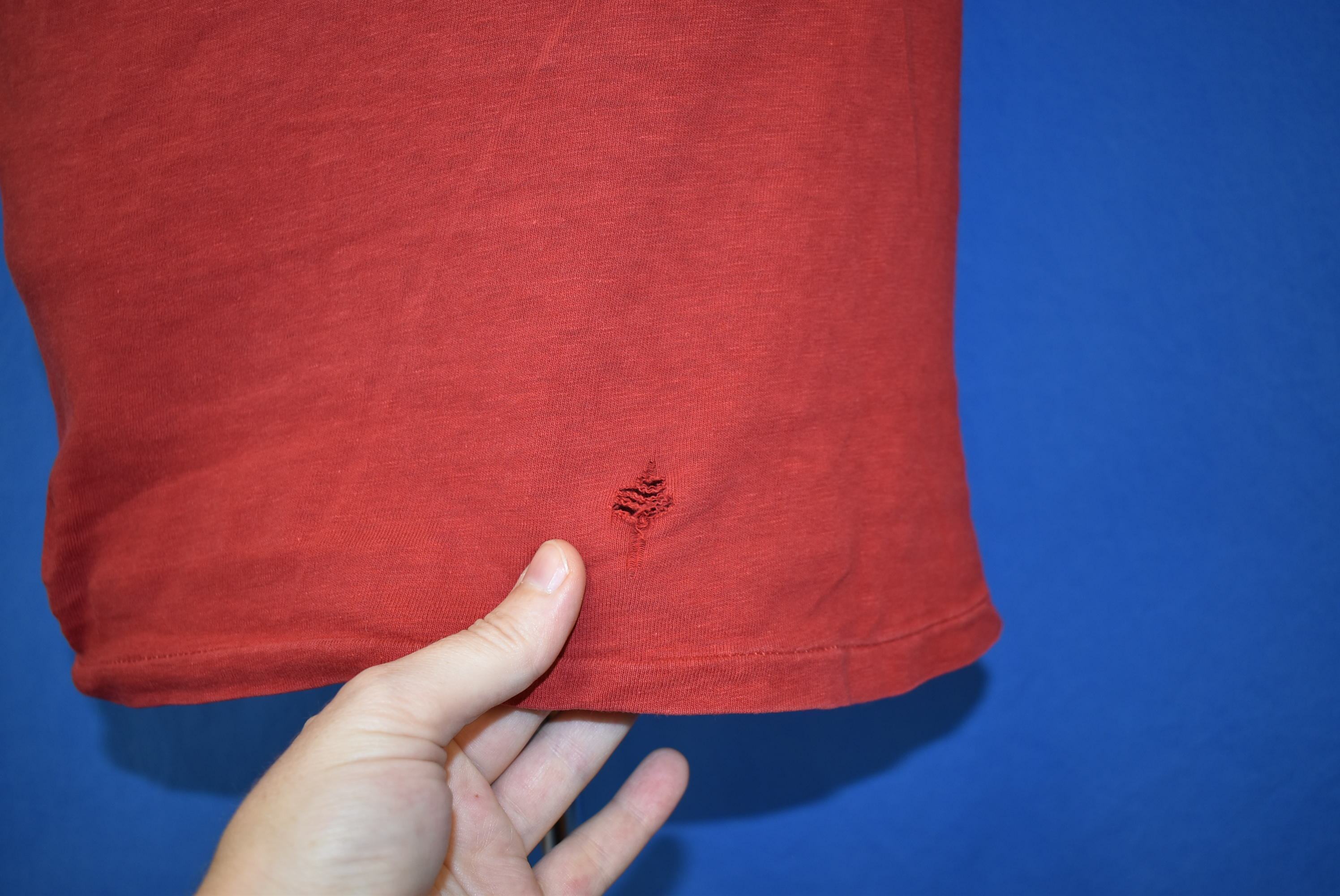 Fits like a modern unisex adult extra small. This shirt is distressed. There are holes on the front, see pic.