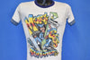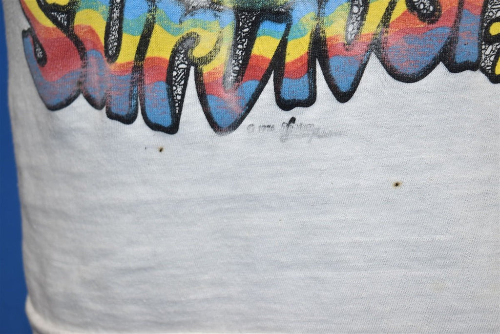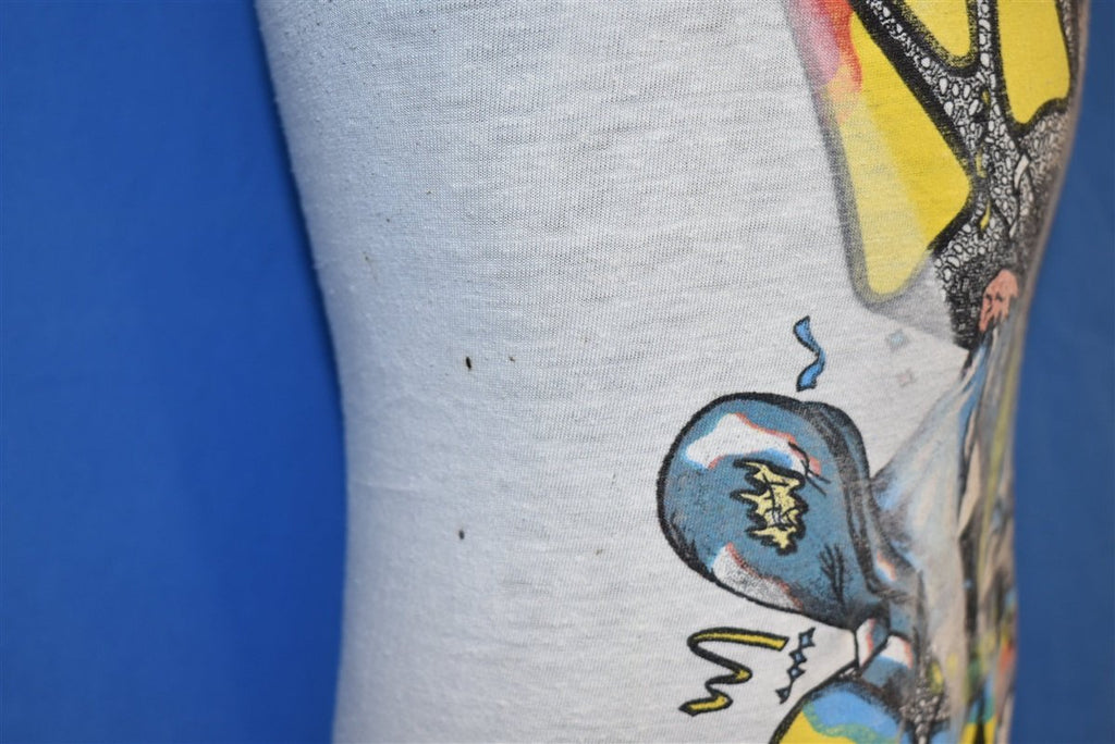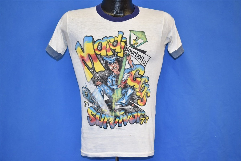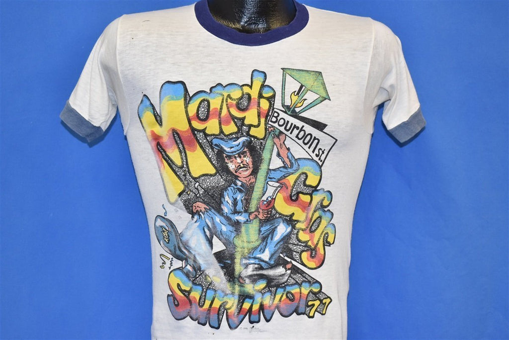 This classic ringer has seen a lot of love since the 1970s giving it the perfect amount of fade and wear. It was made for a brave participant of the famous Mardi Gras celebration in New Orlean, Louisiana. The wild festivities take place annually throughout NOLA including the iconic Bourbon Street. The graphic shows a man barely hanging on as he grips onto his cocktail for dear life. The styling of this cartoon is very reminiscent of airbrush art.