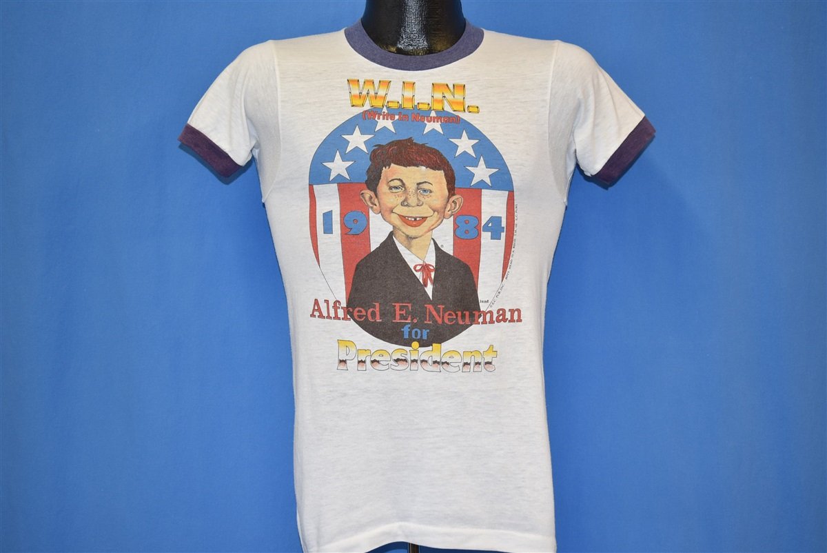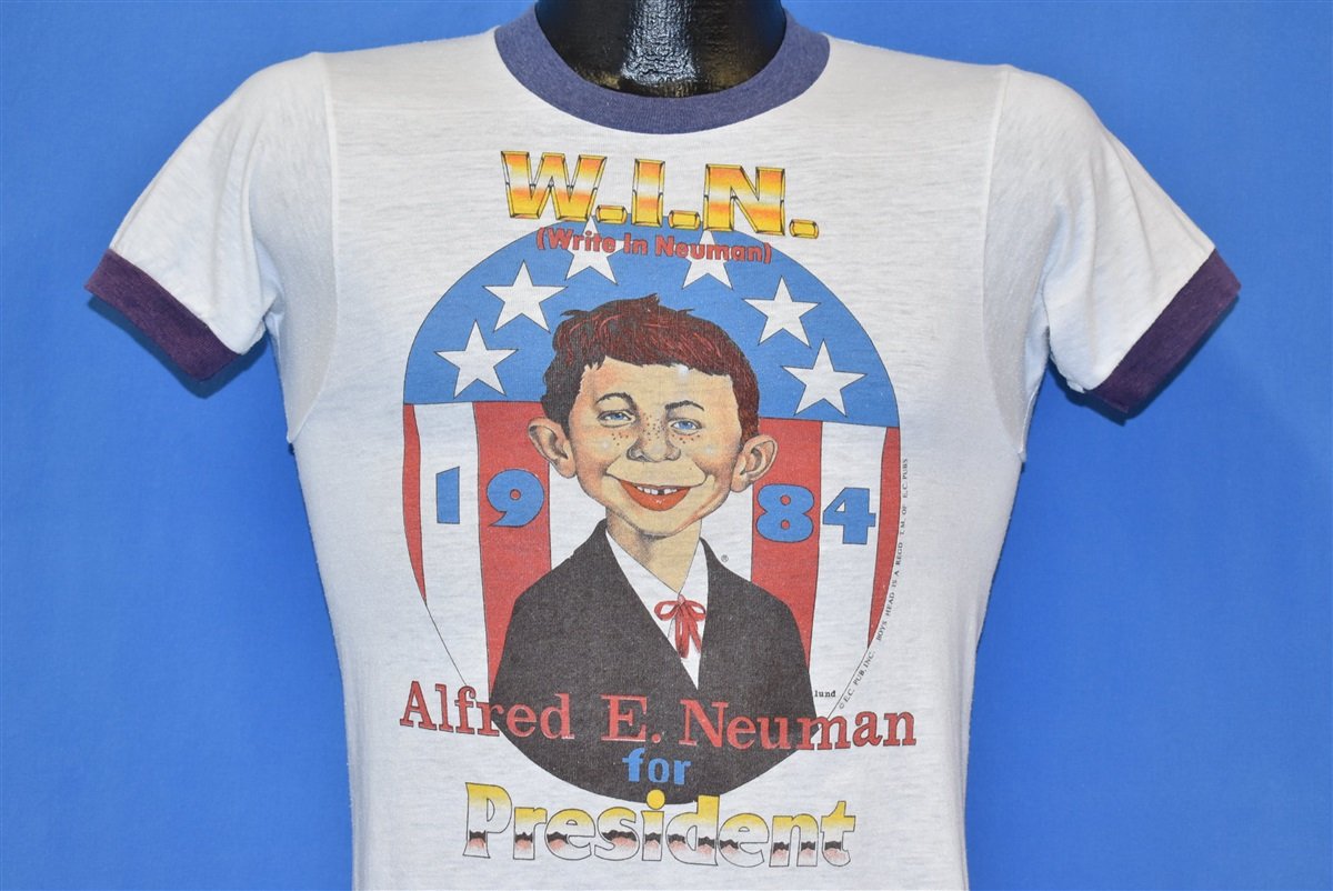 This vintage tee features the legendary Mad magazine mascot, Alfred E Neuman in what appears to be a 1984 election campaign spoof. It's held up great after all this time, preserving that old school charm for years to come. Feature a lovely poly cotton blend, cartoon graphics, and a classic ringer style.