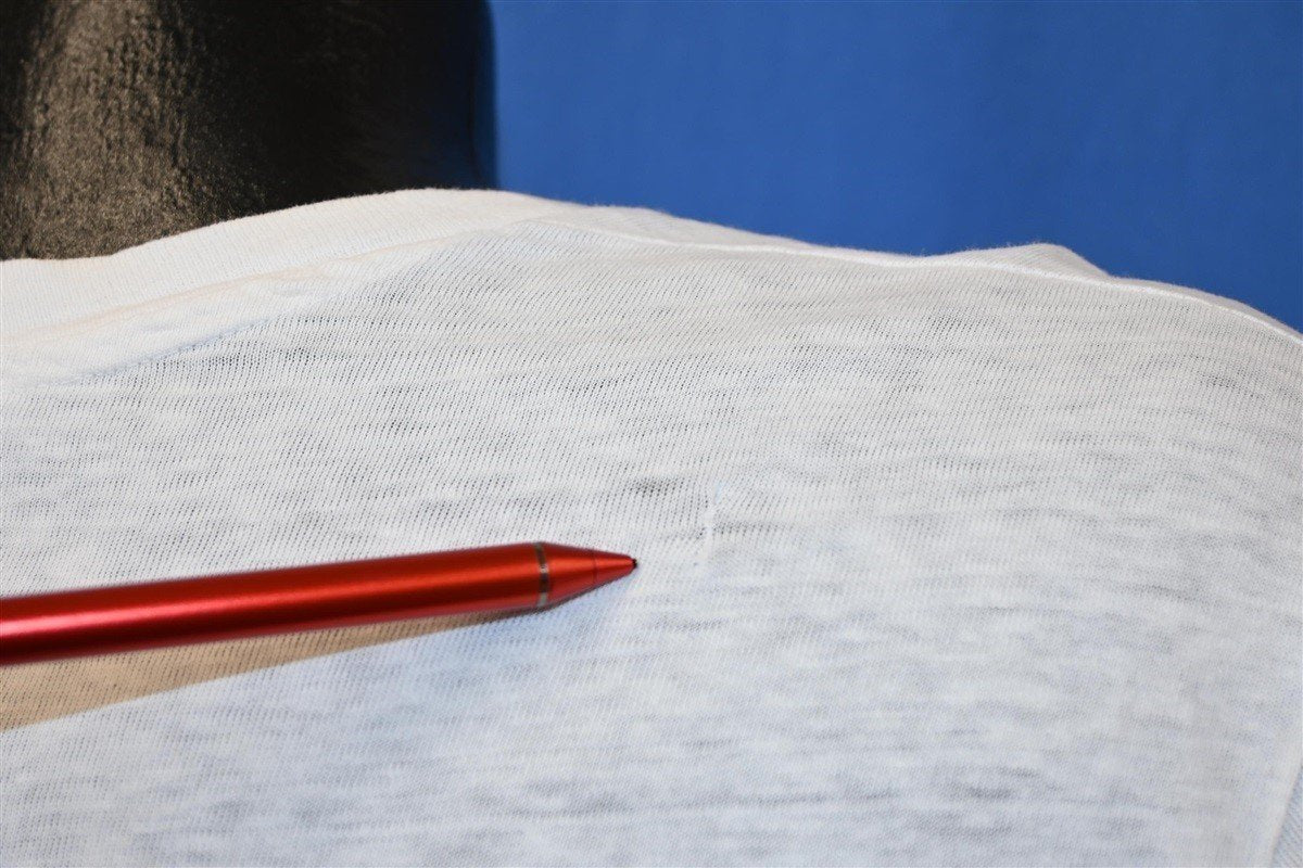 Fits like a modern unisex adult large. There are light spots and a repair on the back right shoulder, see pics.