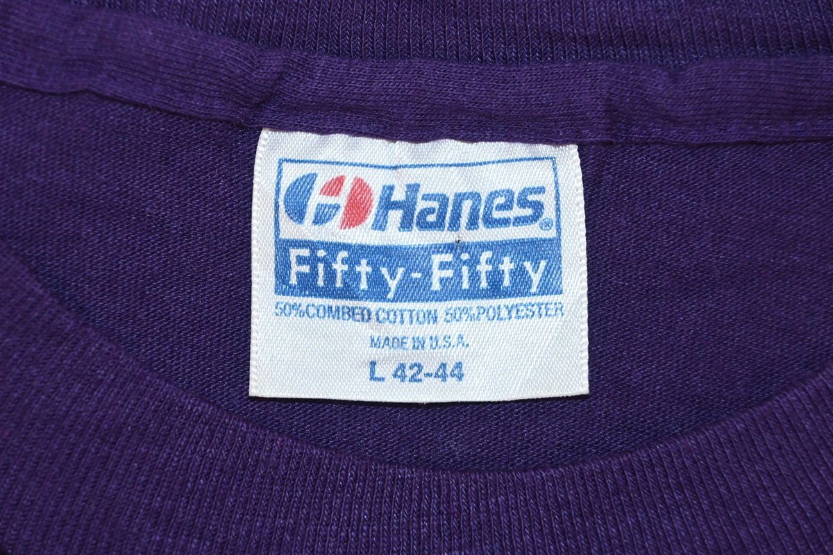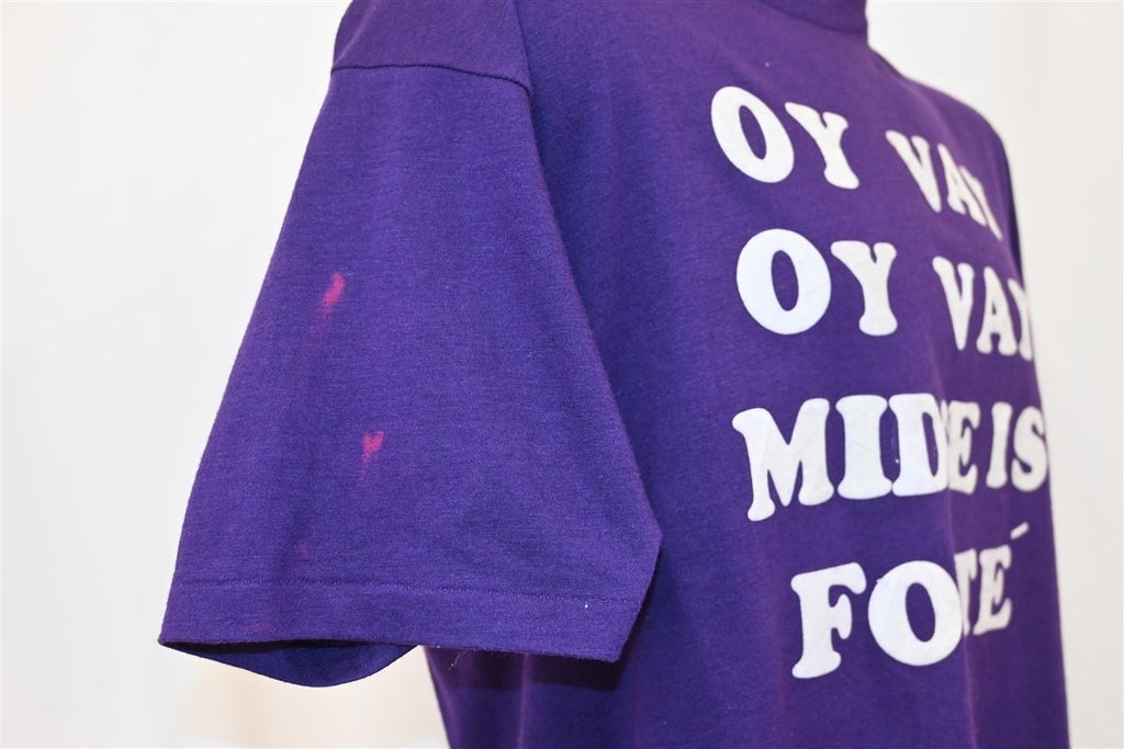 This humorous vintage shirt was customized in the 80s for a 40th birthday celebration. The shirt has flocked letters that read, "Oy vay oy vay Midge is forte". This shirt uses some unique spelling, which shows that whoever made it likely only bought one or two packs of iron on letters, and had to get creative to convey their desired message.