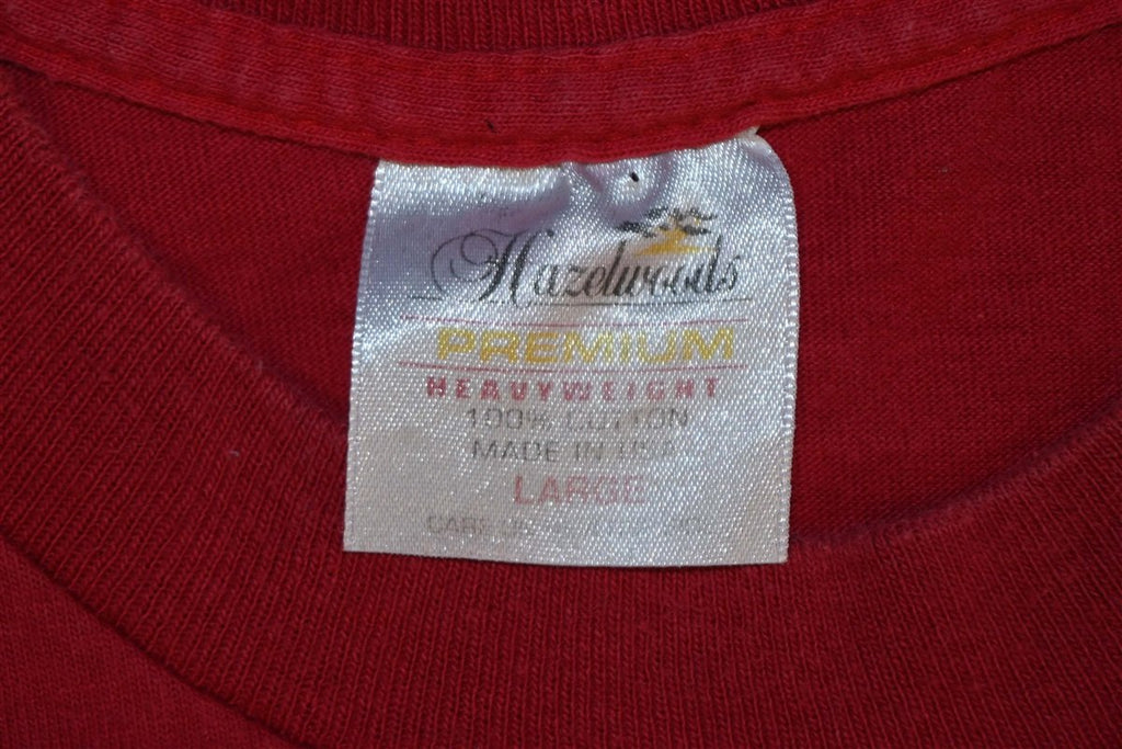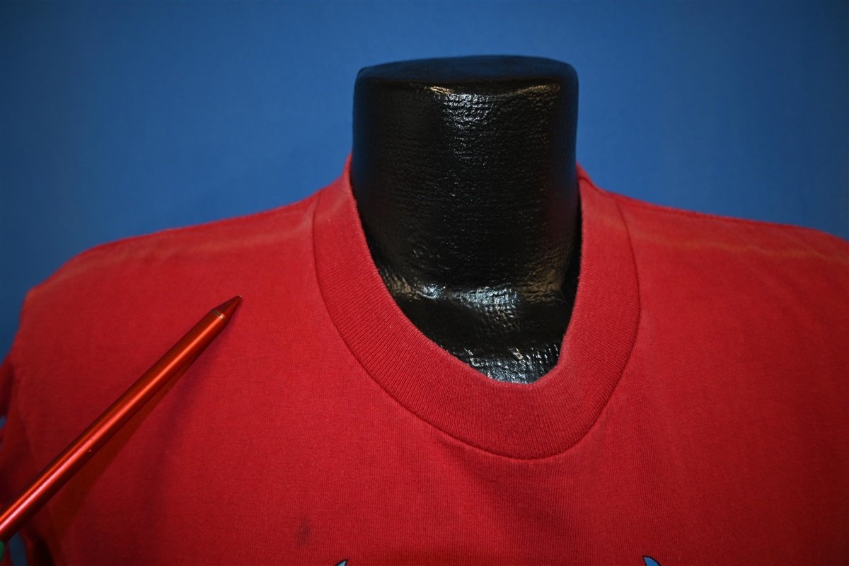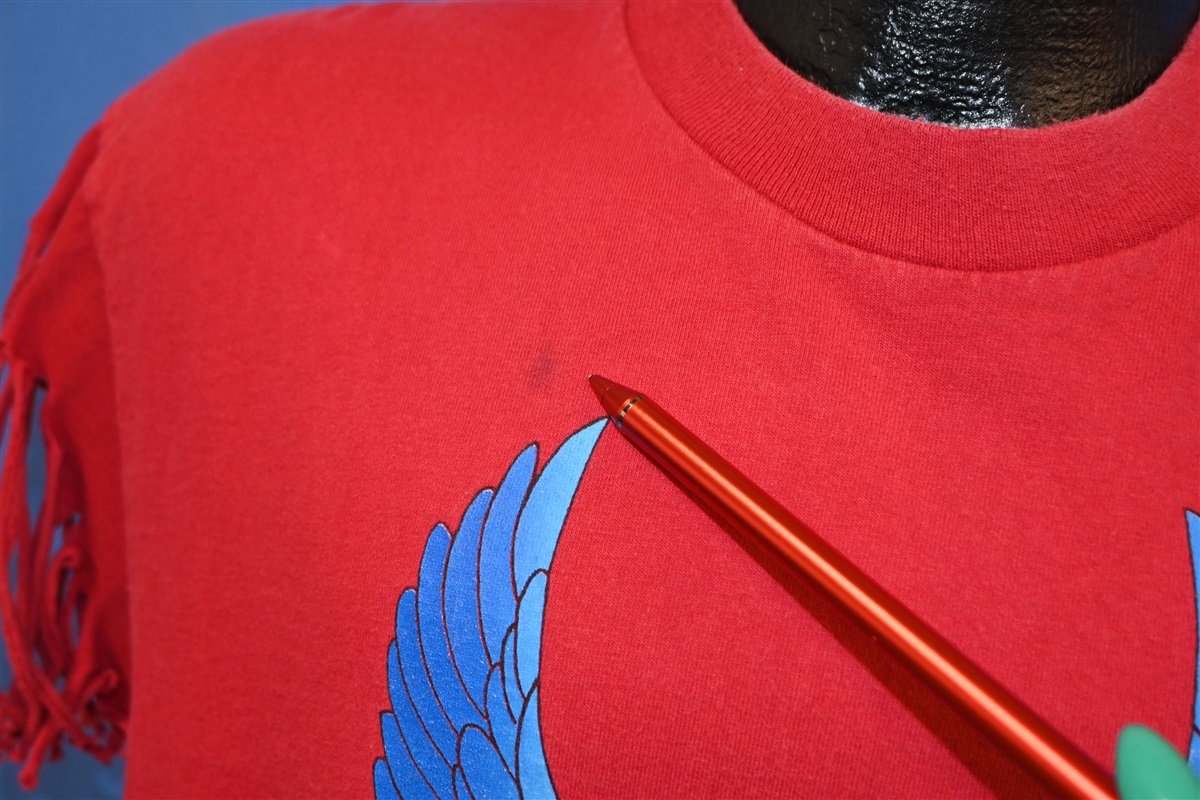 This cool vintage tee has been customized with fringe cut along the button and the sleeves. This shirt celebrates the 54th Annual Sturgis Motorcycle Rally, which took place in 1994. The Sturgis Motorcycle Rally has been a beloved tradition in the Black Hills of South Dakota for many decades. The event has attracted more 700,000 bikers from around the globe, and it involves activities like community rides, races, live concerts and plenty of partying. During the 1994 event, motorcyclists were treated to performances by Blues Traveler, Blue Oyster Cult, Motley Crue, and Great White.