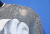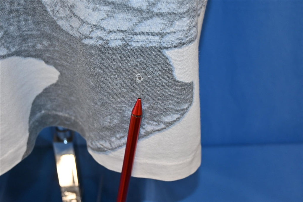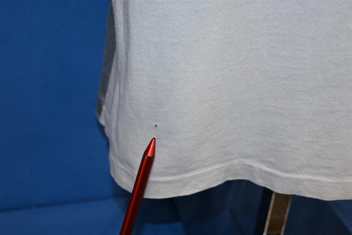 Fits like a modern unisex adult large. There is a bleach spot on the front and two holes on the back, see pics.