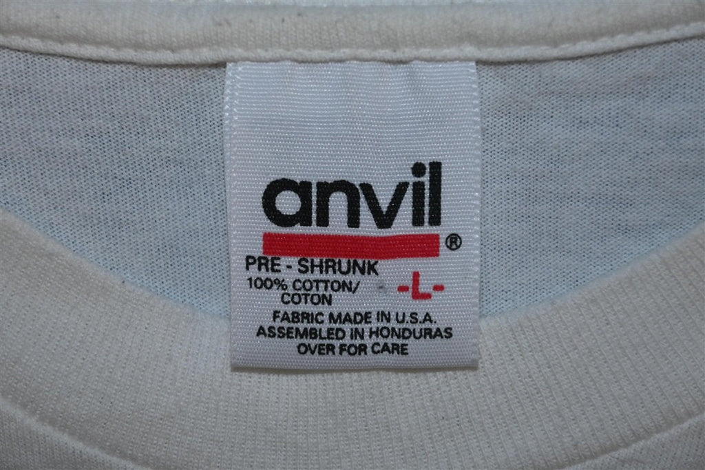 This double-sided tee dates back to the 90s, and it was made for a community group called WAR. The acronym stood for Workers And Residents, a group whose focus was creating a safer environment. The back of this tee includes a hotline number that connects to North Jersey, and it also shows a graphic of various discarded medical waste. It's possible that this tee promoted a group that was formed in response to the syringe tide, an environmental disaster from the late 80s that involved a notable amount of medical waste washing up onto the northern region of the Jersey Shore.