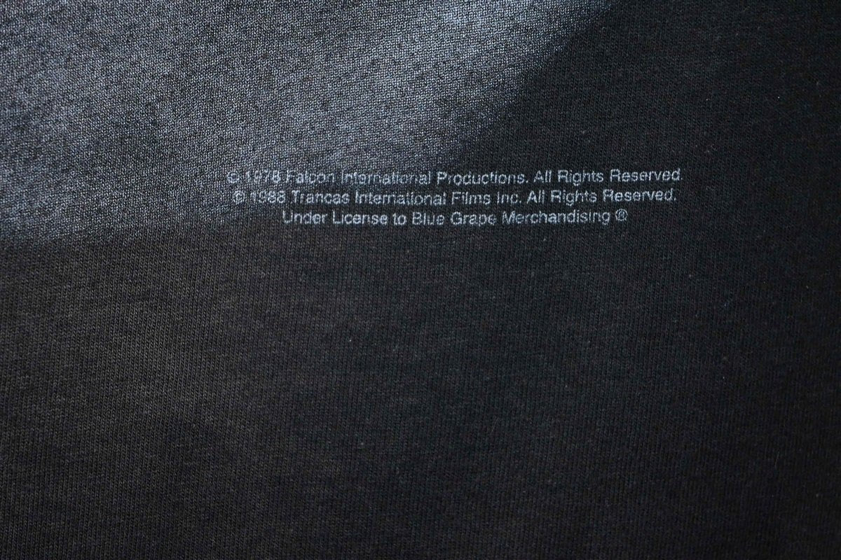 This incredible double-sided shirt celebrates John Carpenter's seminal horror classic, Halloween. While the front showcases the poster art from the original 1978 film, the back features a portrait of the haunting Michael Myers. This shirt was made decades after the original film debuted, which is a testament to the movie's lasting legacy. Halloween helped to popularize many staples of the horror genre, including classic tropes like the final girl and the silent, masked murderer. Halloween also kicked off the movie career of Jamie Lee Curtis, who starred as Laurie Strode in both the original and several of its sequels and reboots.
