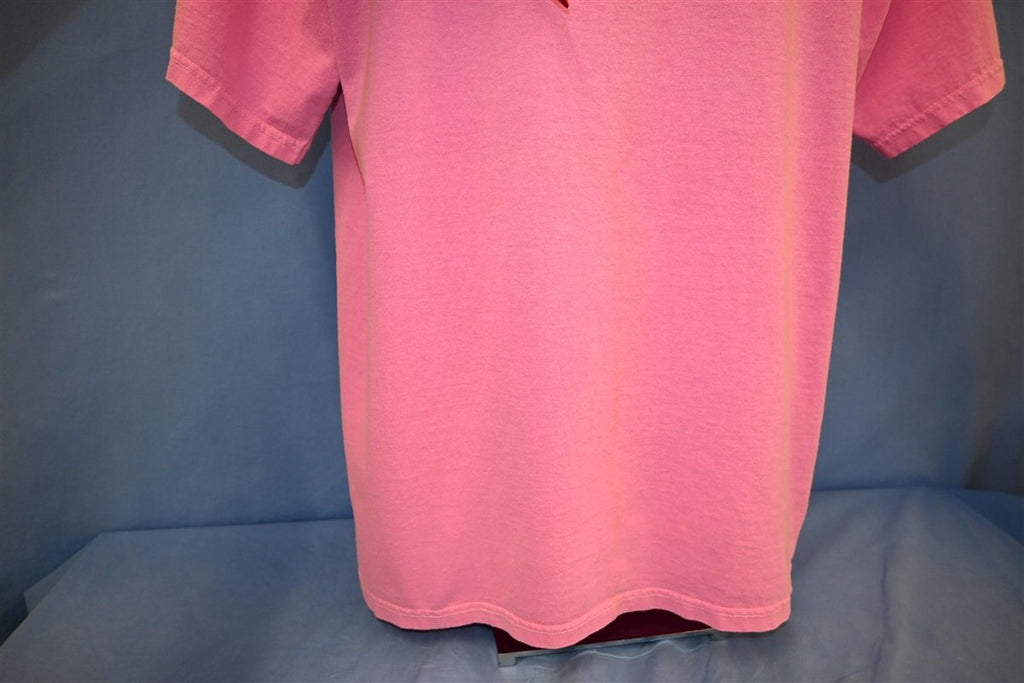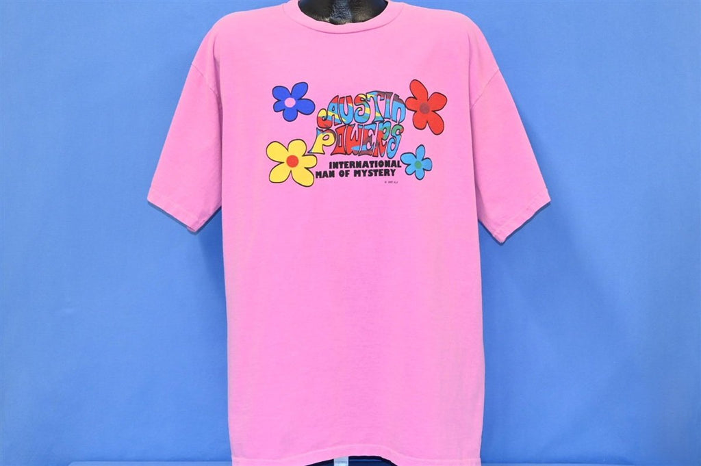 This brightly colored tee promotes the first film in the hilarious Austin Powers trilogy, Austin Powers: International Man of Mystery. The back of the tee includes a tag line that reads, "Frozen in the 60s... thawing spring '97 baby!" Austin Powers was a comedic spoof of 60s pop culture and British spy films, that was written by and starred former Saturday Night Live cast member Mike Myers. Austin Powers was Myers' first project following the end of his run as an SNL regular, and the movie was a critical and commercial success that has since been lauded as one of the best comedies of the decade.