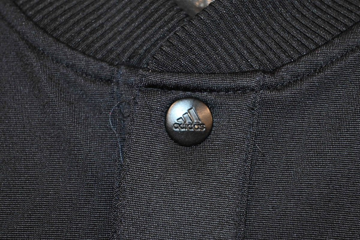 This sweet track jacket is an awesome piece of vintage sportswear from the brand Adidas. Made from a silky black polyester material, this jacket also features the company's signature three stripes going down the sleeves. Other details include snap up closures, two front hand pockets, and the Adidas equipment logo that was introduced in 1991. This new design replaced the famous Adidas trefoil, but it still aligned with the company's three stripe trademark. Supposedly the inspiration behind the new three bars logo, was the view from inside an Adidas shoe.