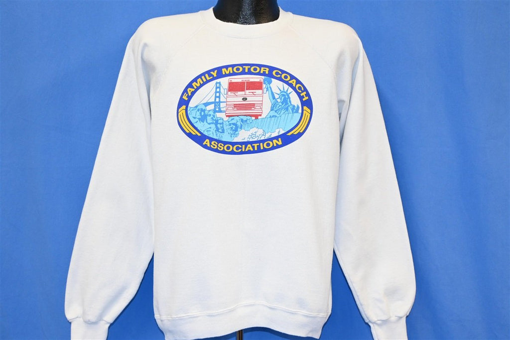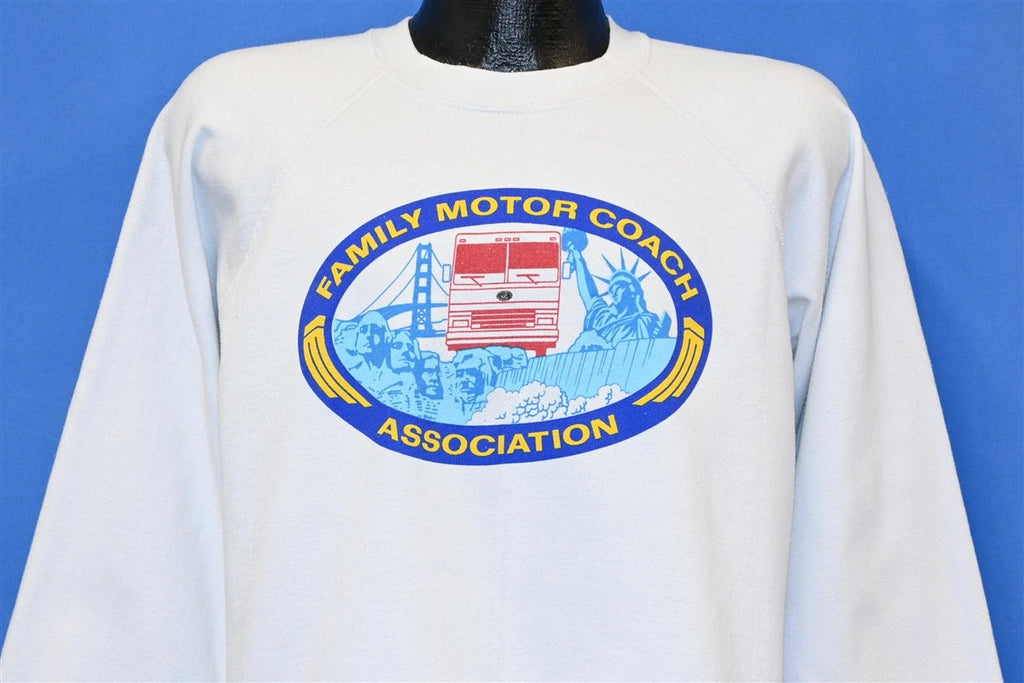 This vintage raglan sweatshirt reps the Family Motor Coach Association, also known as the FMCA. This international organization was founded back in 1963, and it is for families who both own and enjoy the use of recreational vehicles. Headquartered in Cincinnati, Ohio, FMCA is a member-owned organization that is governed by volunteer officers. Membership requires the ownership of an RV, and the organization schedules social events and supplies RVing information for participating families.