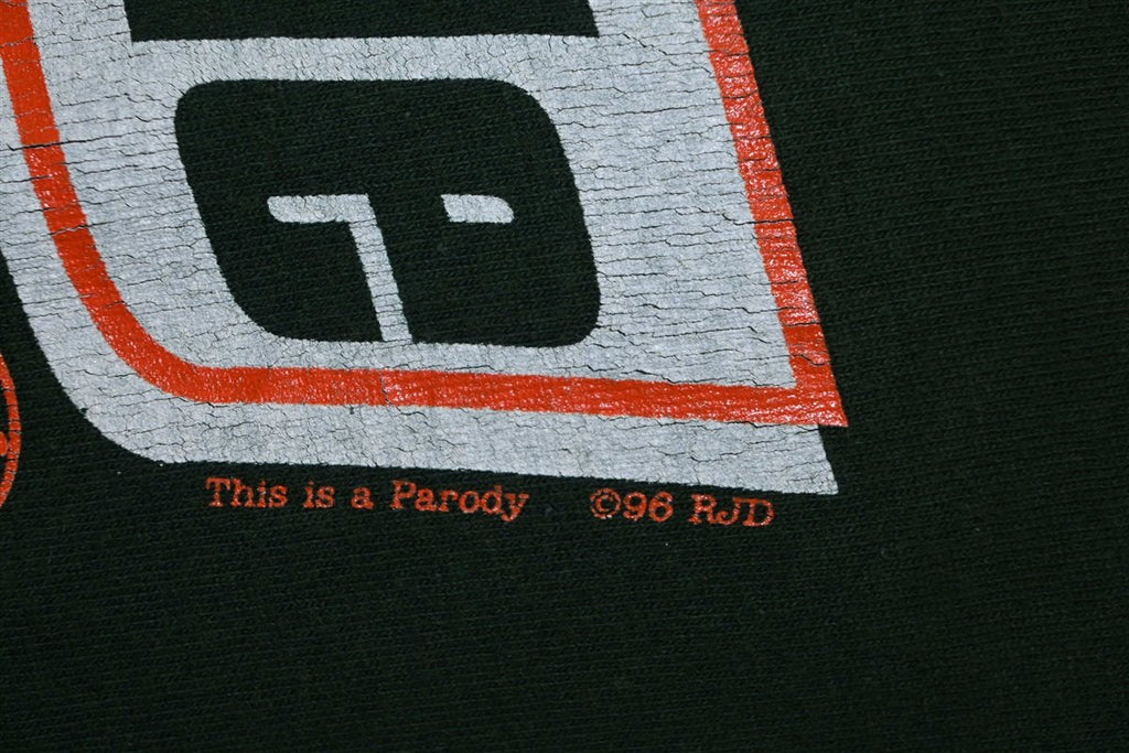 This funny vintage tee features a parody of the classic Gatorade logo. The iconic sports drink was first developed in 1965, and made specifically to help hydrate the athletes at the University of Florida, hence the name Gatorade, in honor of the Florida Gators. This tee instead markets a product called "Get Lade", which is described as a "lust quencher". The shirt is copyright to a company called RJD and a disclaimer openly admits that "this is a parody". There's not a lot of information surrounding the brand RJD, but there records of some other parody designs that they made, including one for Tommy Hilfiger that says "totally hungover" and one that re-imagines Trix cereal as Domina-Trix.