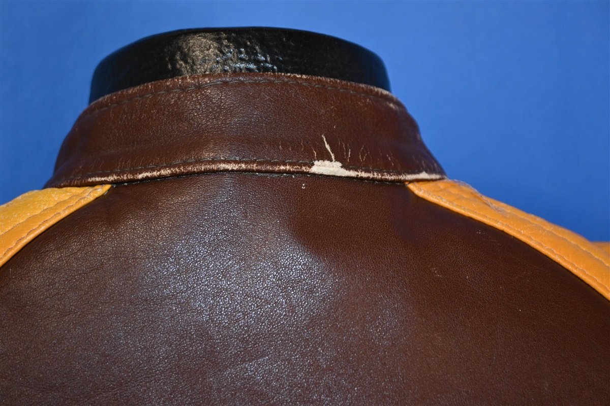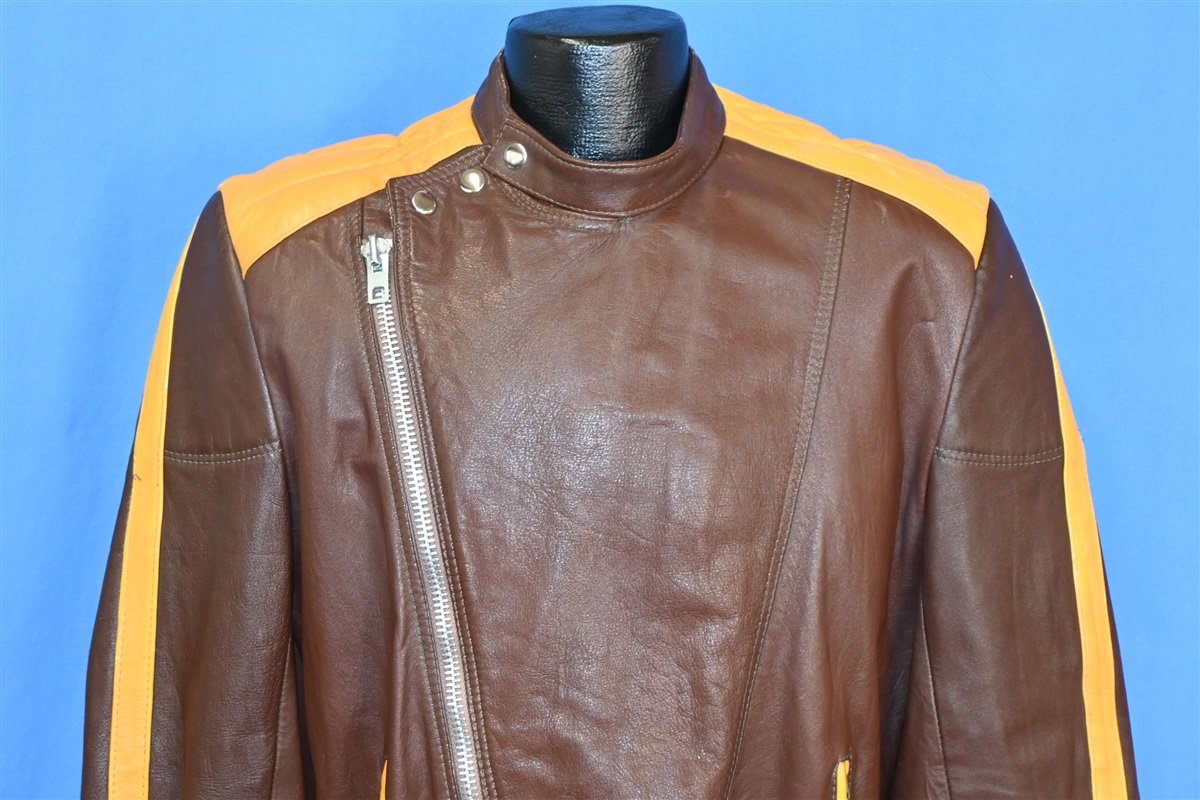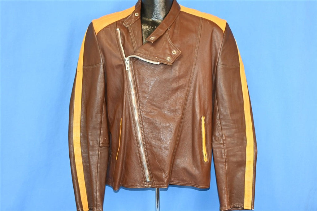 This stylish vintage jacket is made from a handsome brown leather with yellow accents running down the sleeves and over the shoulders. The jacket was made by the brand Rocky in the 80s. This motorcycle style jacket includes a zip front closure that leads up to a banded collar with snap closures. The jacket also has zippered pockets and zippers along the cuffs.