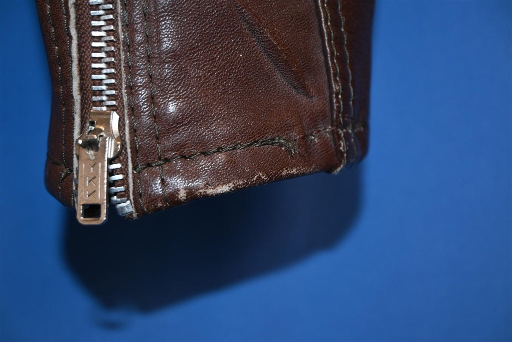 Fits like a modern unisex adult large. There is some wear around the collar and some wear on the jacket, see pics. The leather on this jacket is not stretchy.