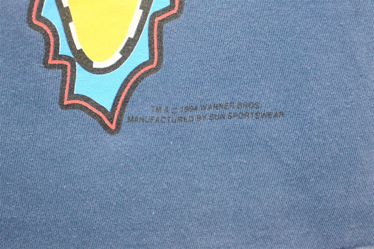 This cool tee was made for the "rootinist tootinist pop this side of the Mississippi", and it features Yosemite Sam of Looney Tunes fame. This diminutive yet fiery cowboy is one of the main adversaries of Bugs Bunny, and he was first introduced in the 1945 cartoon Hare Trigger. Like many iconic Looney Tunes, he was originally voiced by Mel Blanc, although this shirt was made in the 90s when the character was primarily voiced by Greg Burson. In the 90s, Sam also appeared periodically in Tiny Toon Adventures, and the show also gave him a younger Acme Looniversity counterpart named Montana Max.