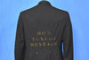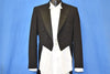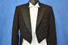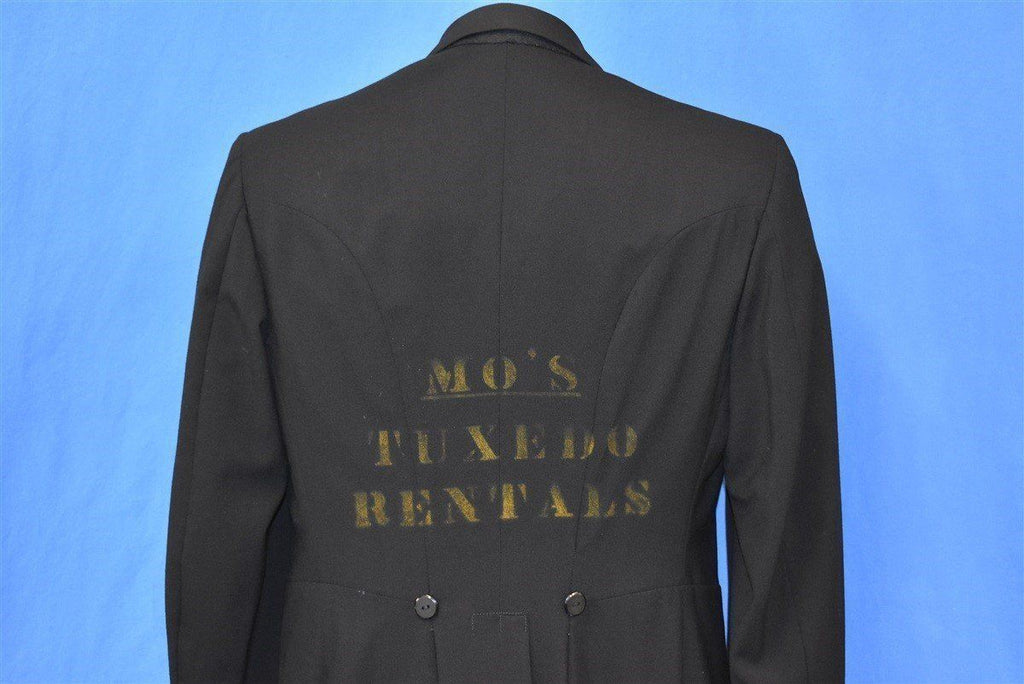 This vintage tuxedo features a stylish long tail coat with three buttons going down each side. The tuxedo jacket has satin facing on the lapels and includes a single chest pocket. The back of the jacket meanwhile features a fun joke. The black jacket is printed with yellow lettering which reads, "Mo's Tuxedo Rentals" in what appears to be spray painted stenciled lettering.